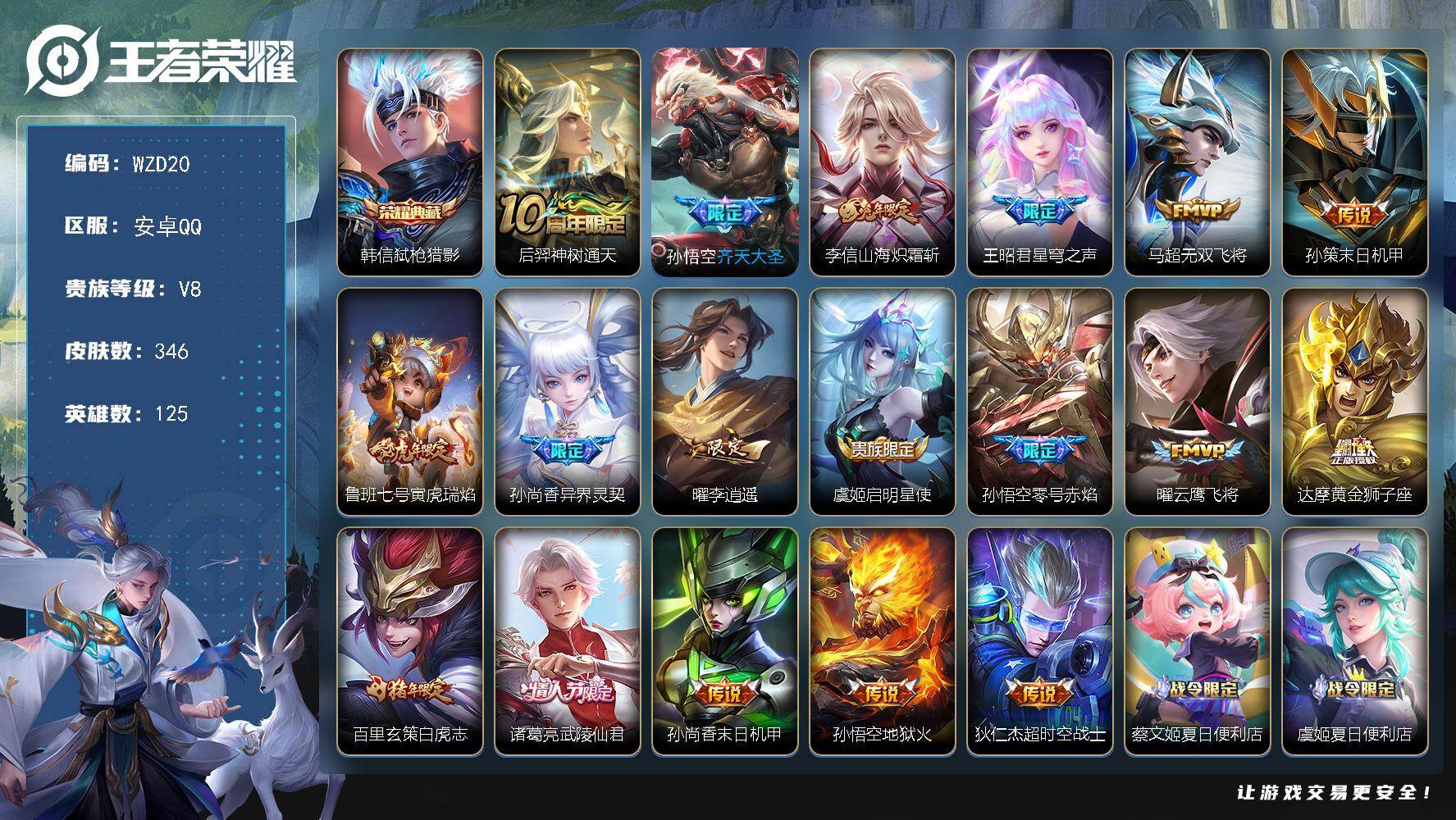 【金标孙悟空 金标曜】实名: 可修改 贵族等级: V7 英雄数: 126 皮肤