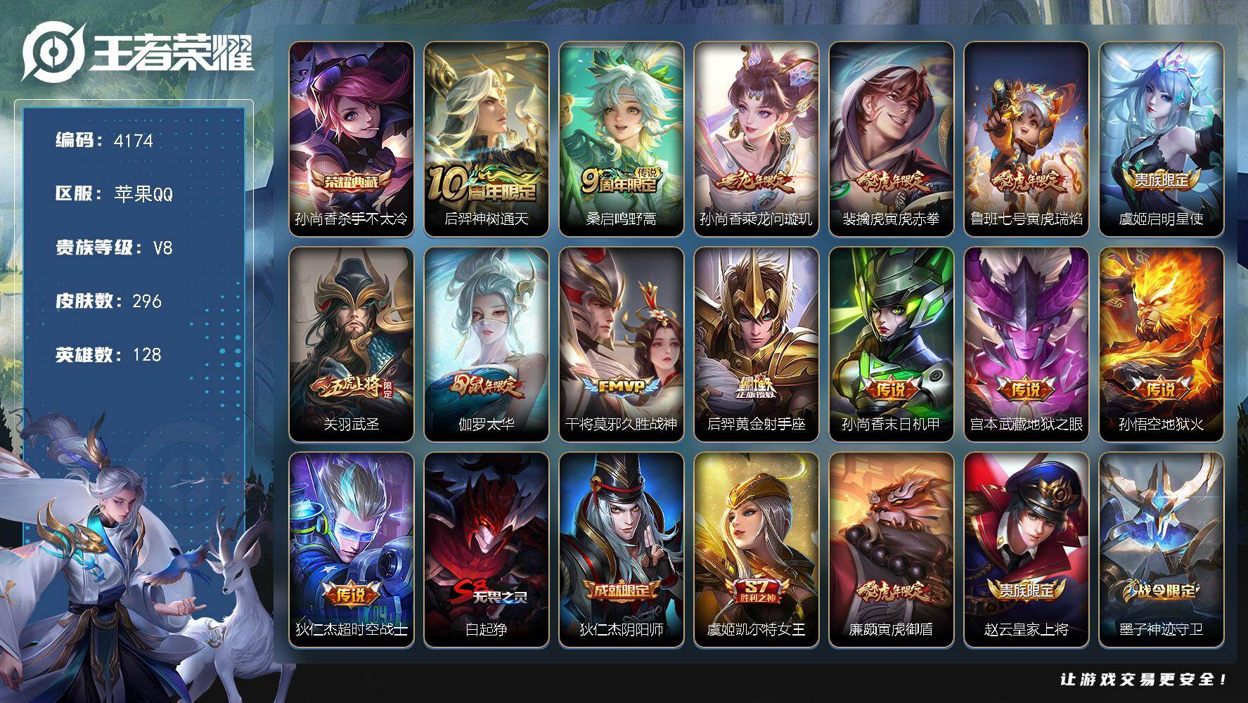 苹果Q-V8-至尊星耀II段位-128英雄-296皮肤-1典藏皮肤-14传说-