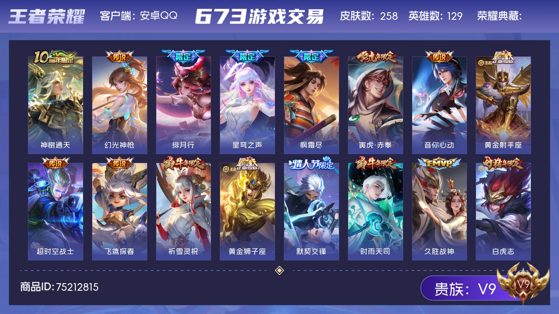 V9 皮肤258 英雄129 永恒钻石 传说19 其他皮肤245