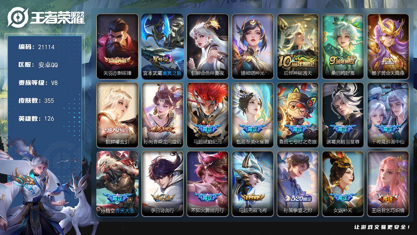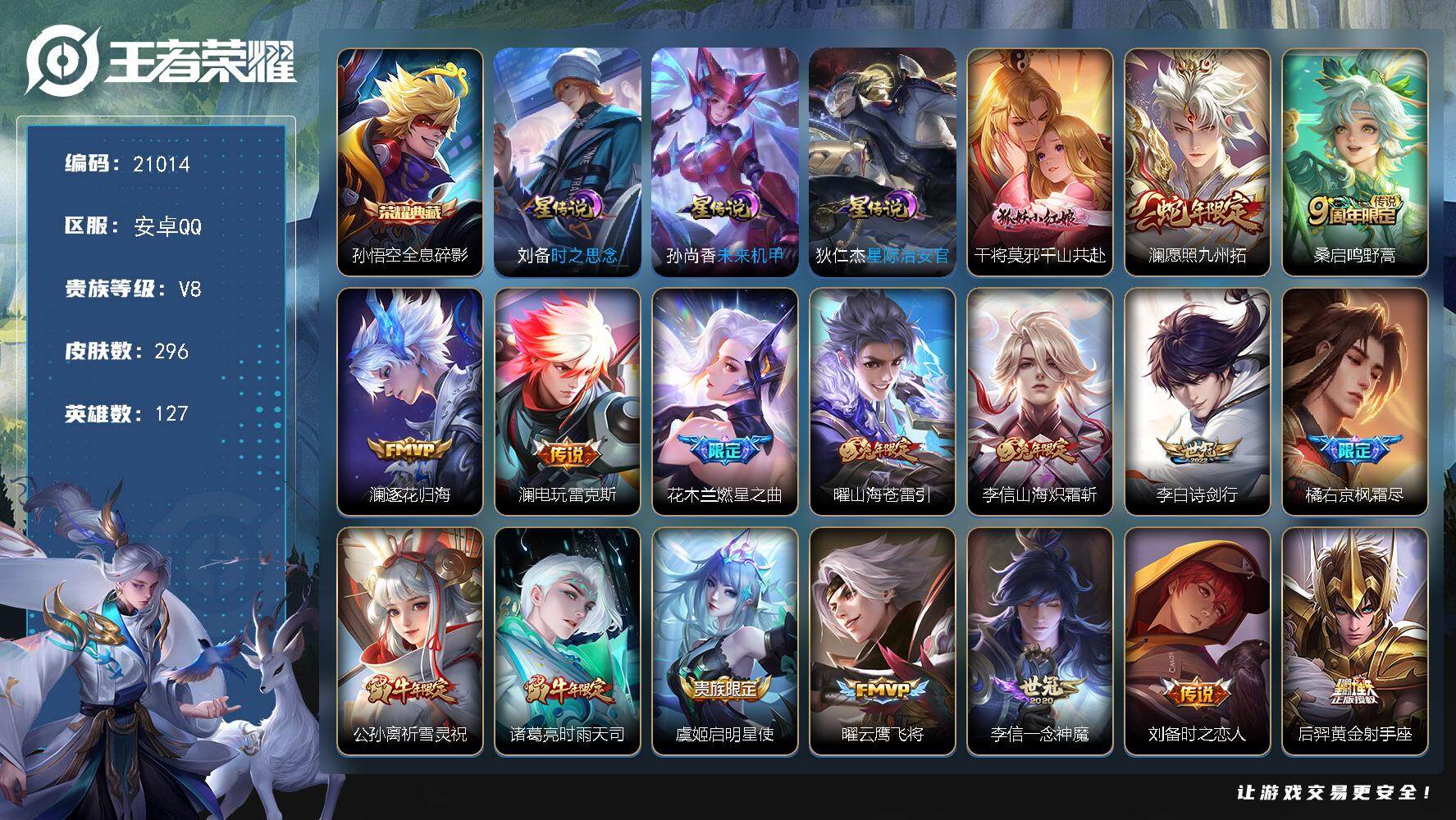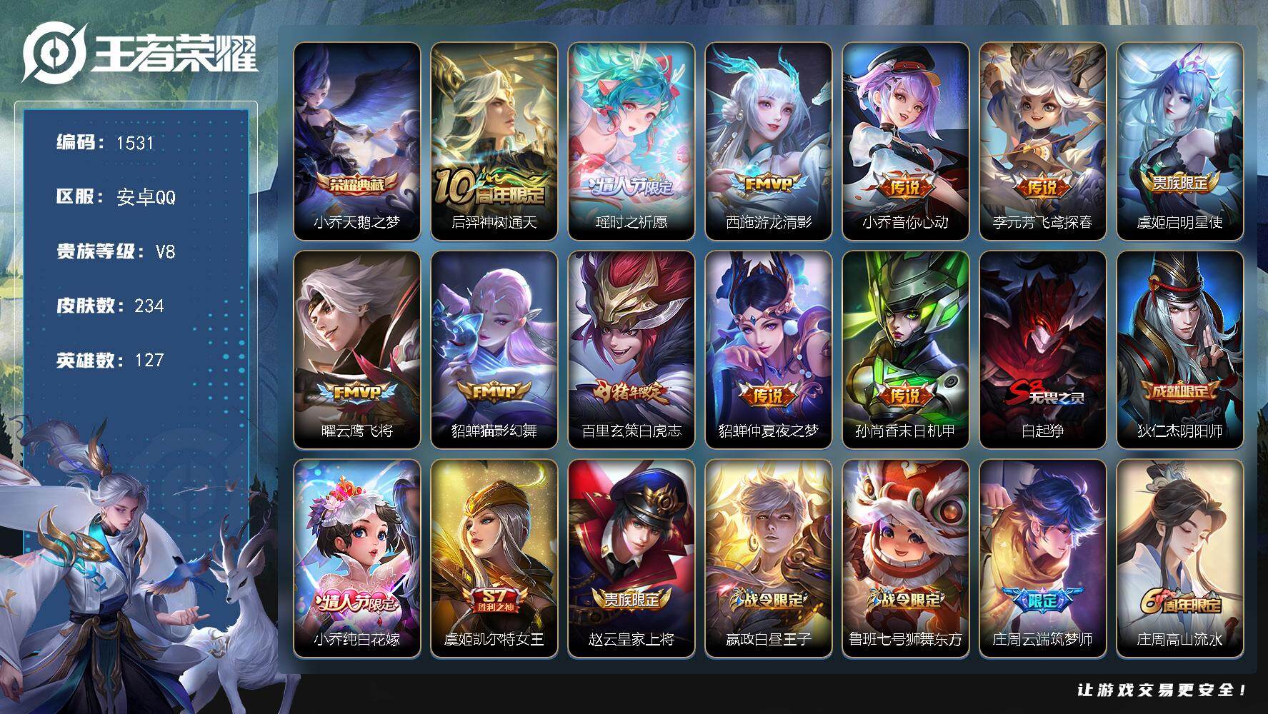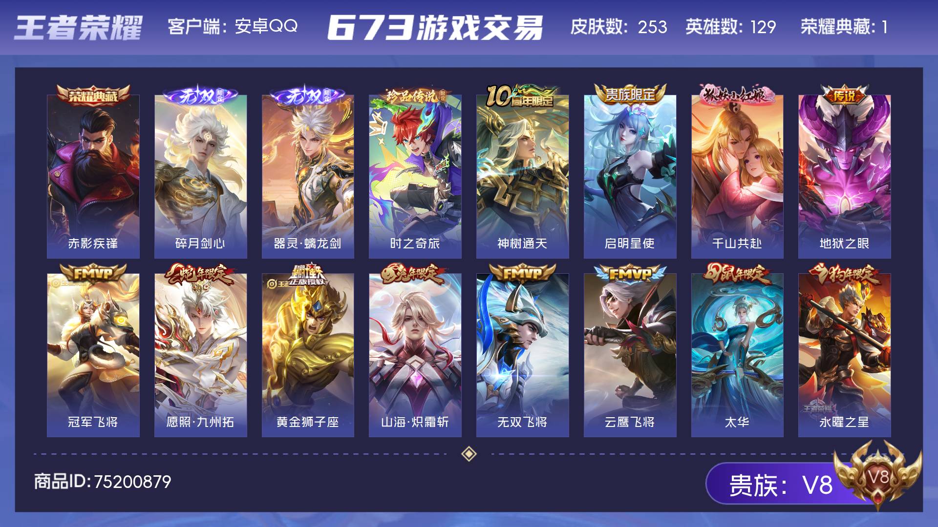 V8 皮肤253 英雄129 至尊星耀 荣耀典藏1 无双皮肤2 珍品传说1 星传说3 传说16 其他