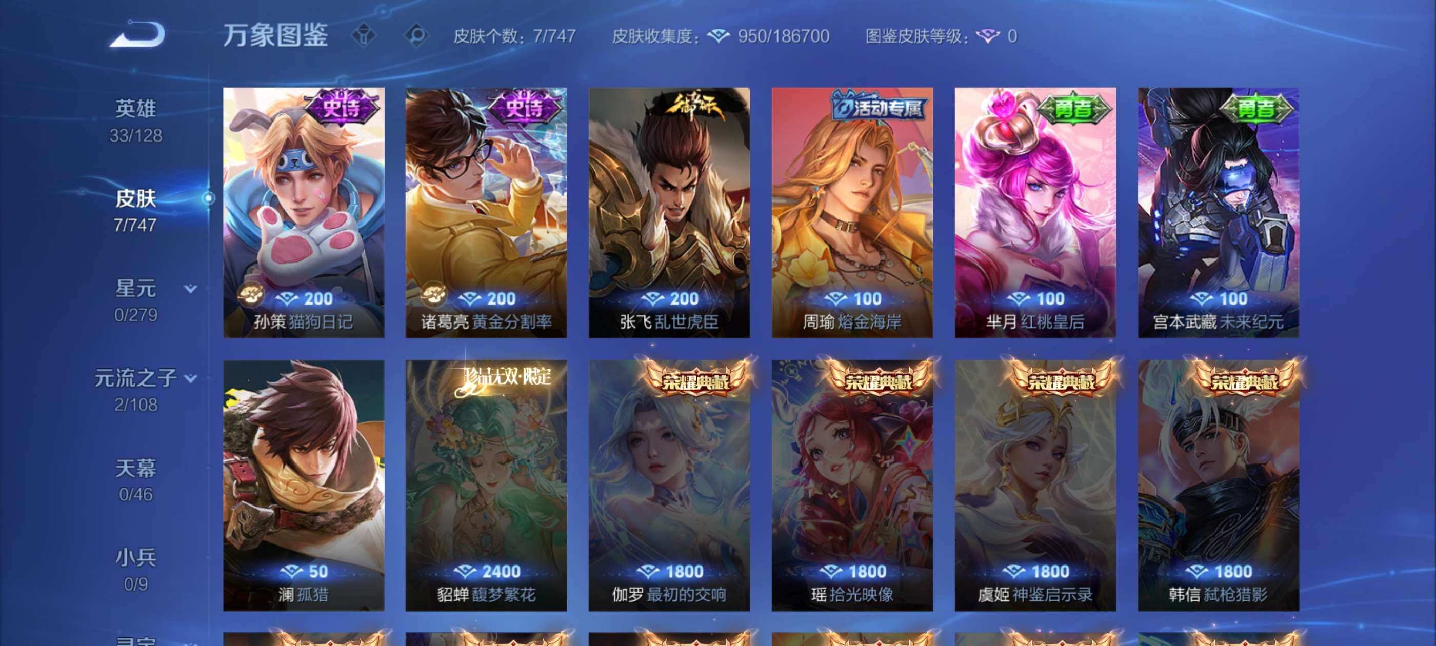 安卓v/绝世王者/166皮肤/126英雄/1典藏/1珍品无双/2无双/3珍品传说/22传说/54史