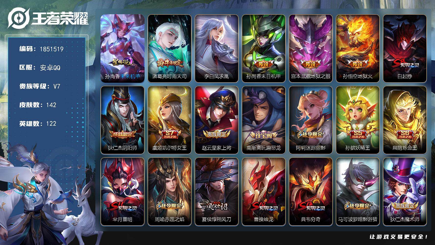 V7 12传说 122英雄 158皮肤 可修改实名 【稀有英雄】大司命