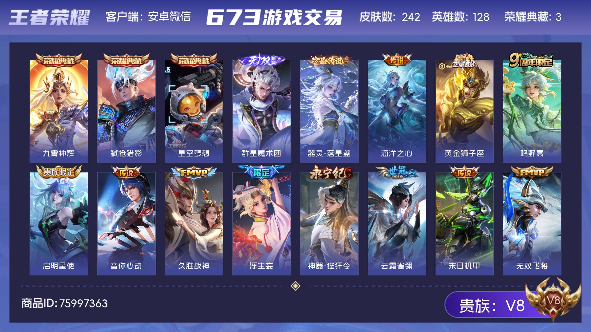 V8 皮肤242 英雄128 至尊星耀 荣耀典藏3 无双皮肤1 珍品传说1 传说13 其他皮肤231