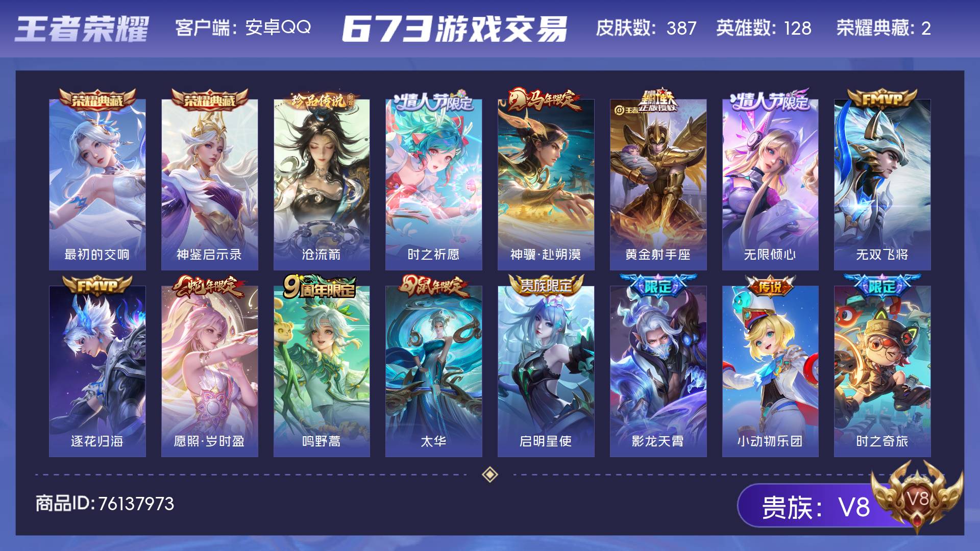 V8 皮肤387 英雄128 无双王者 荣耀典藏2 珍品传说1 传说23