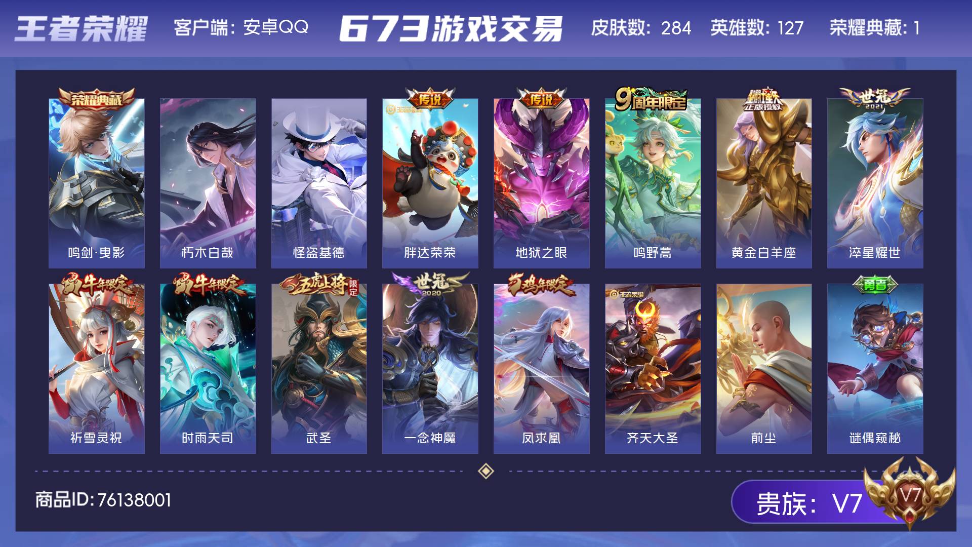 V7 皮肤284 英雄127 非凡王者 荣耀典藏1 珍品传说2 传说11