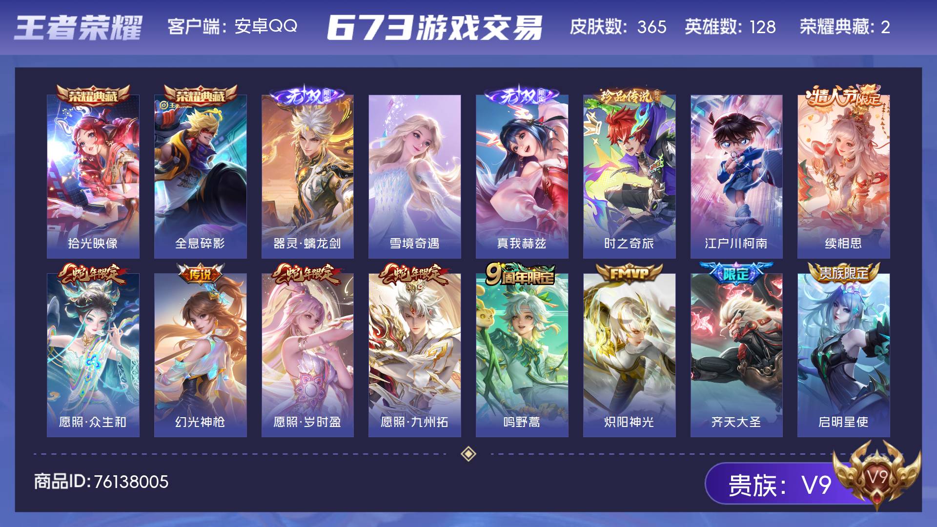 V9 皮肤365 英雄128 荣耀王者 荣耀典藏2 无双皮肤3 珍品传说2 传说16