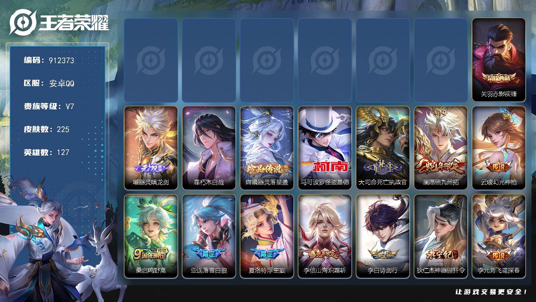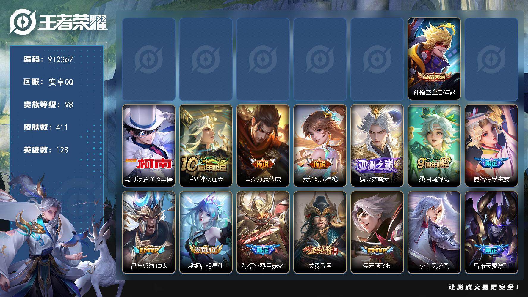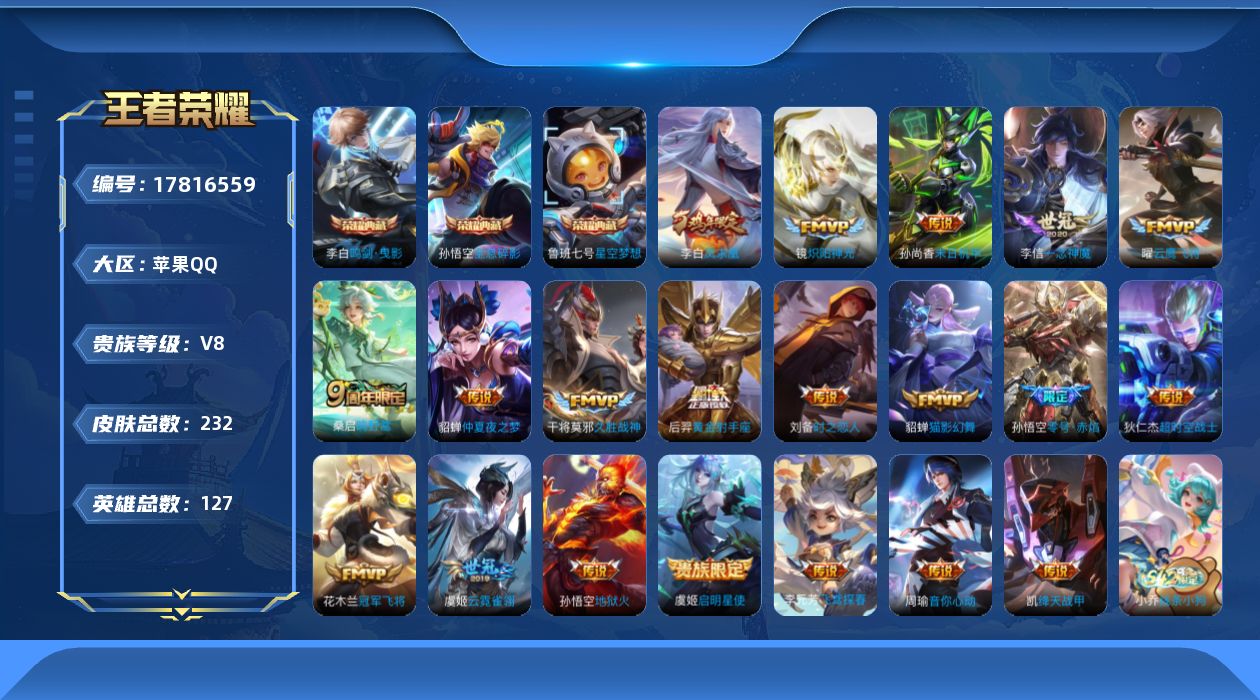 V8-最强王者段位-127英雄-232皮肤-3典藏皮肤-20传说-58史诗