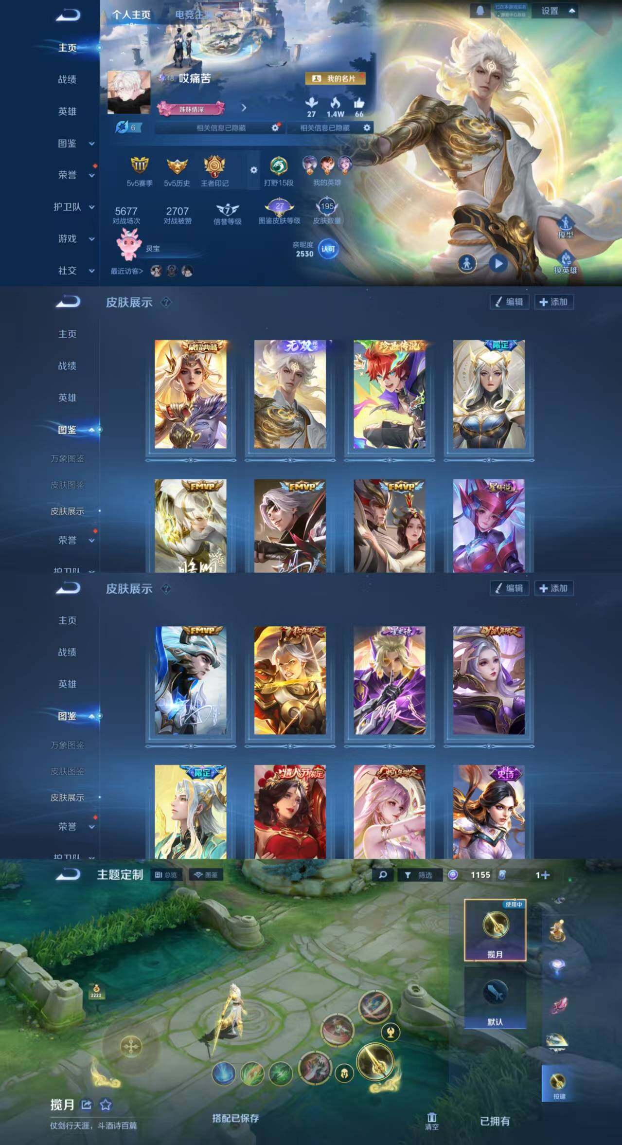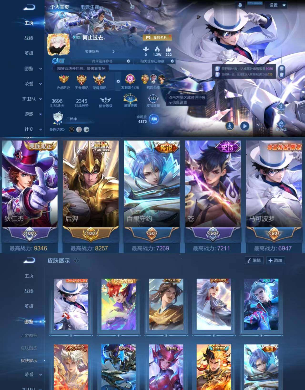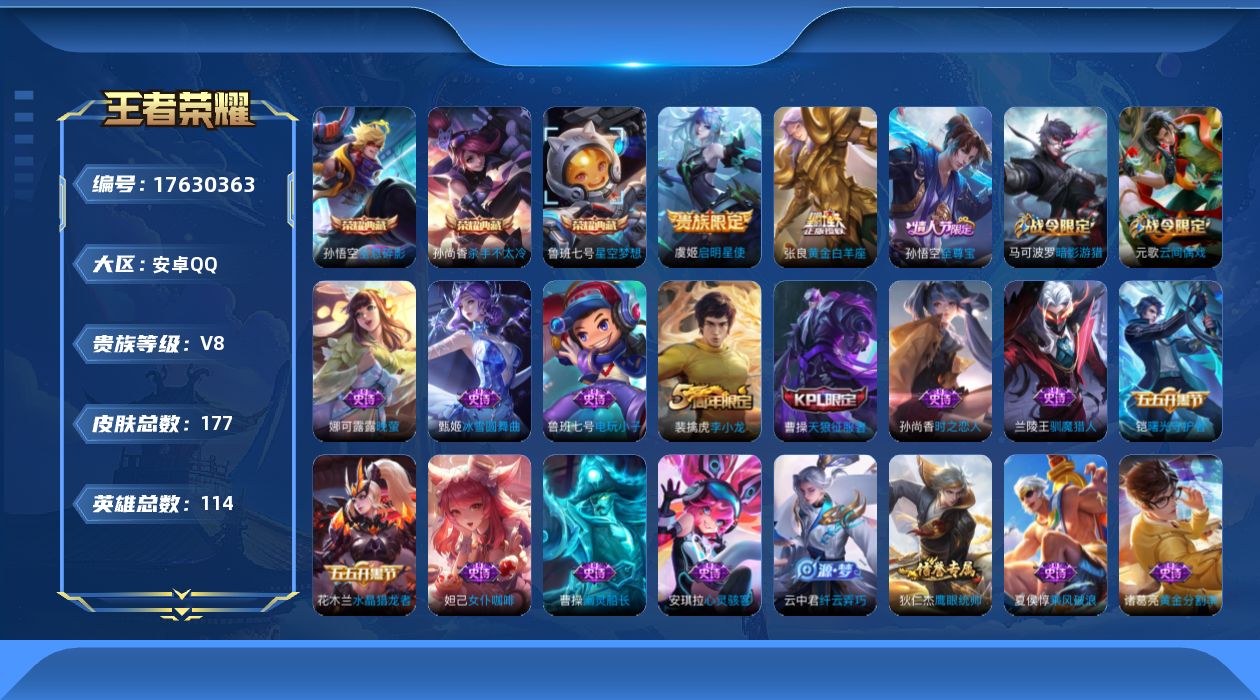 V8-最强王者段位-127英雄-267皮肤-2典藏皮肤-1无双-1珍品传说-23传说-84史诗