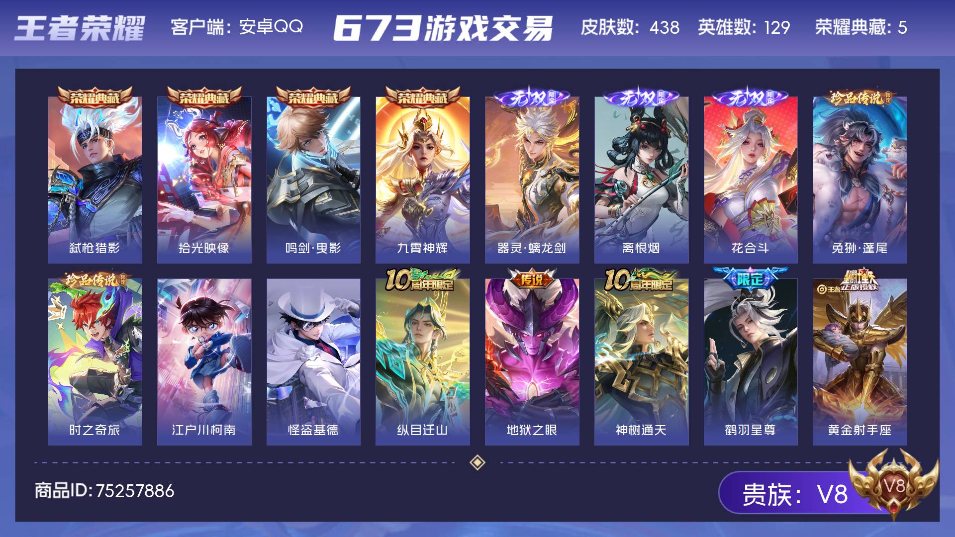 V8 皮肤438 英雄129 最强王者 荣耀典藏5 无双皮肤3 珍品传说4 传说31 其他皮肤401