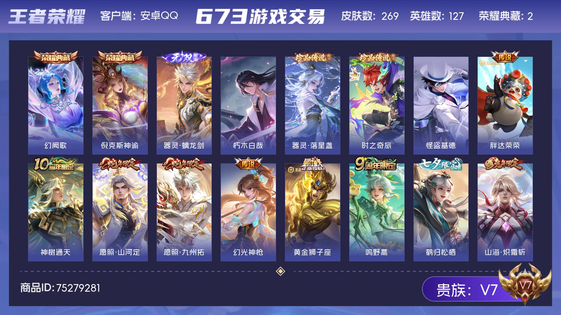 V7 皮肤269 英雄127 最强王者 荣耀典藏2 无双皮肤1 珍品传说4 传说13 其他皮肤255