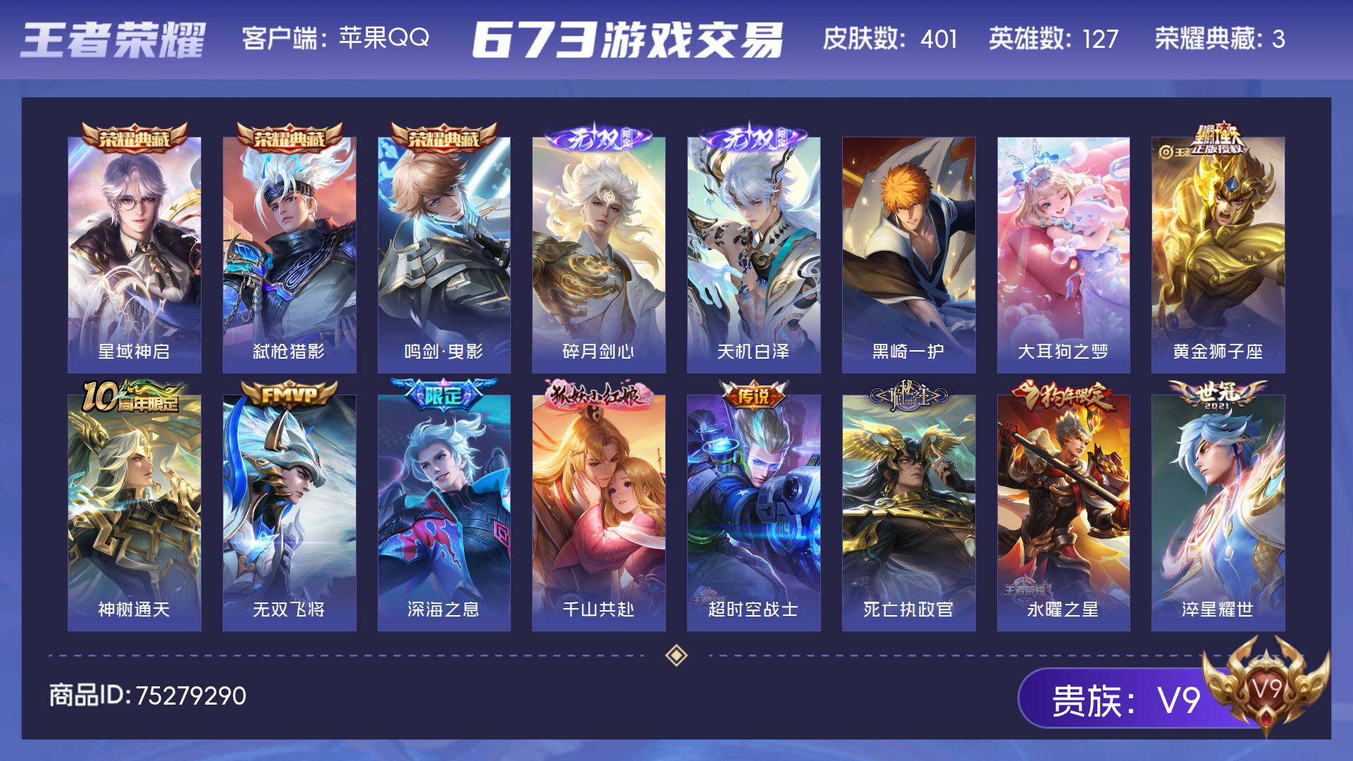 V9 皮肤401 英雄127 非凡王者 荣耀典藏3 无双皮肤2 珍品传说2 传说17 其他皮肤382