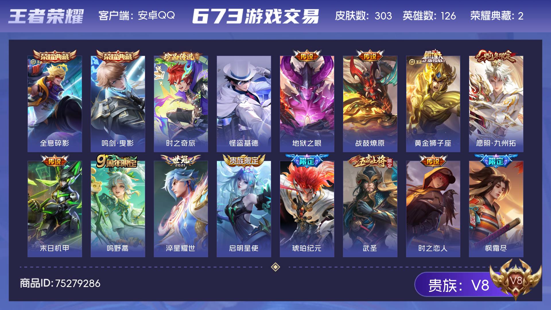 V8 皮肤303 英雄126 至尊星耀 荣耀典藏2 珍品传说2 传说19 其他皮肤284