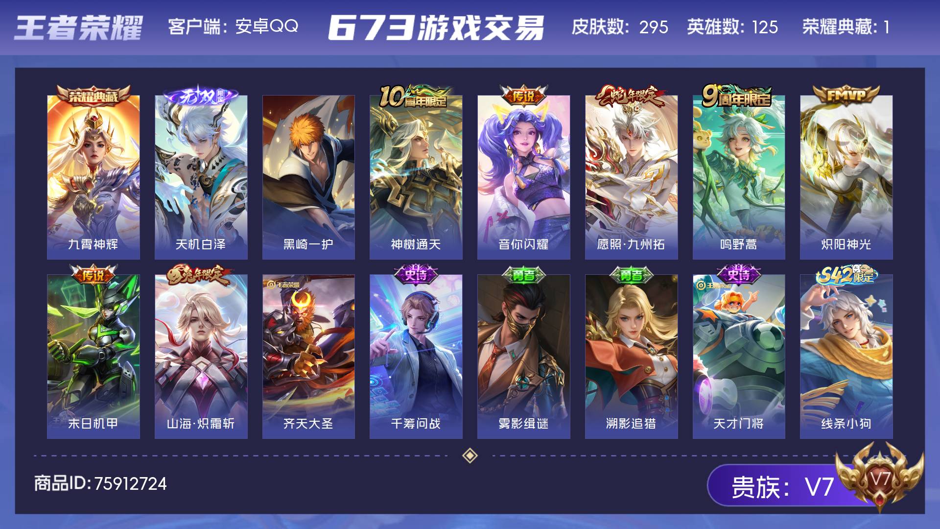 V7 皮肤295 英雄125 至尊星耀 荣耀典藏1 无双皮肤1 珍品传说1 星传说1 传说8 其他皮