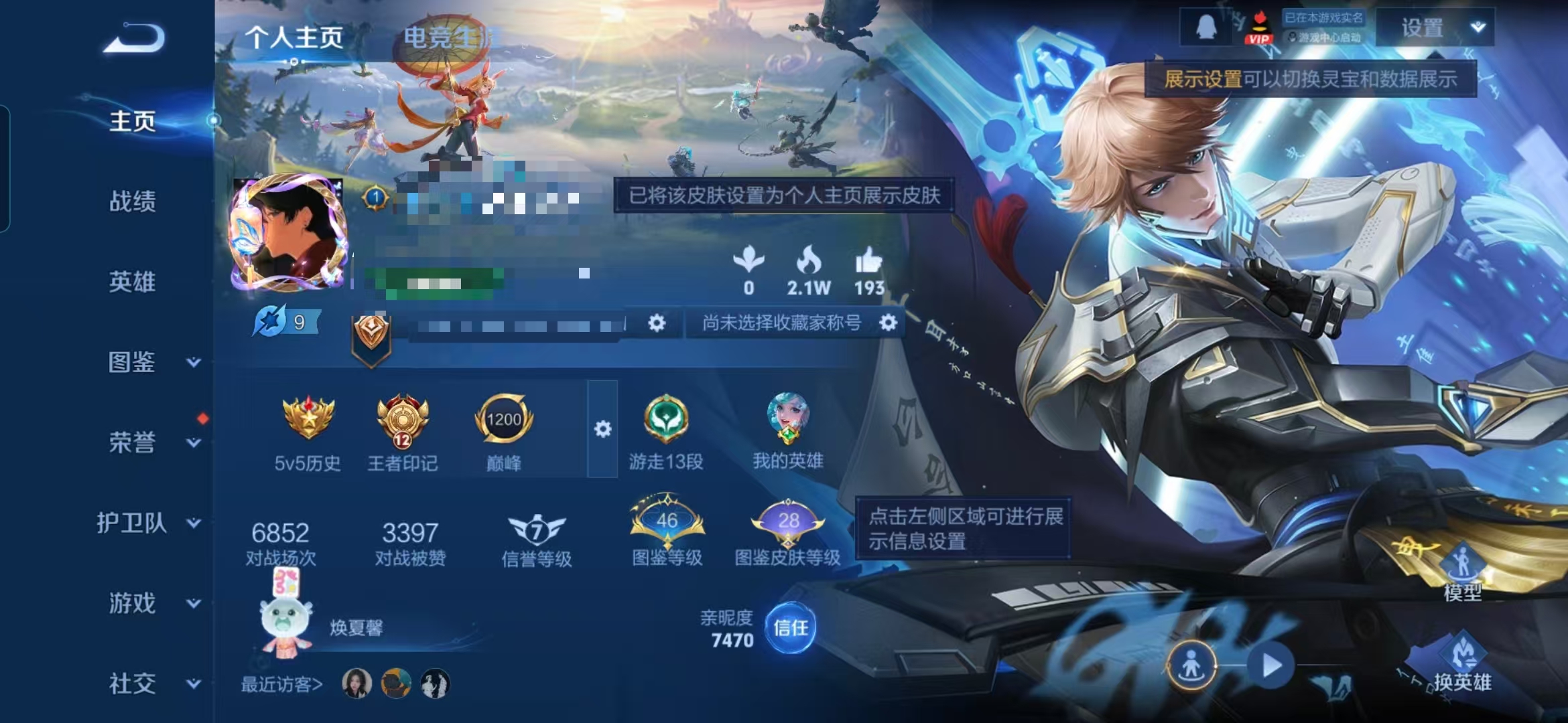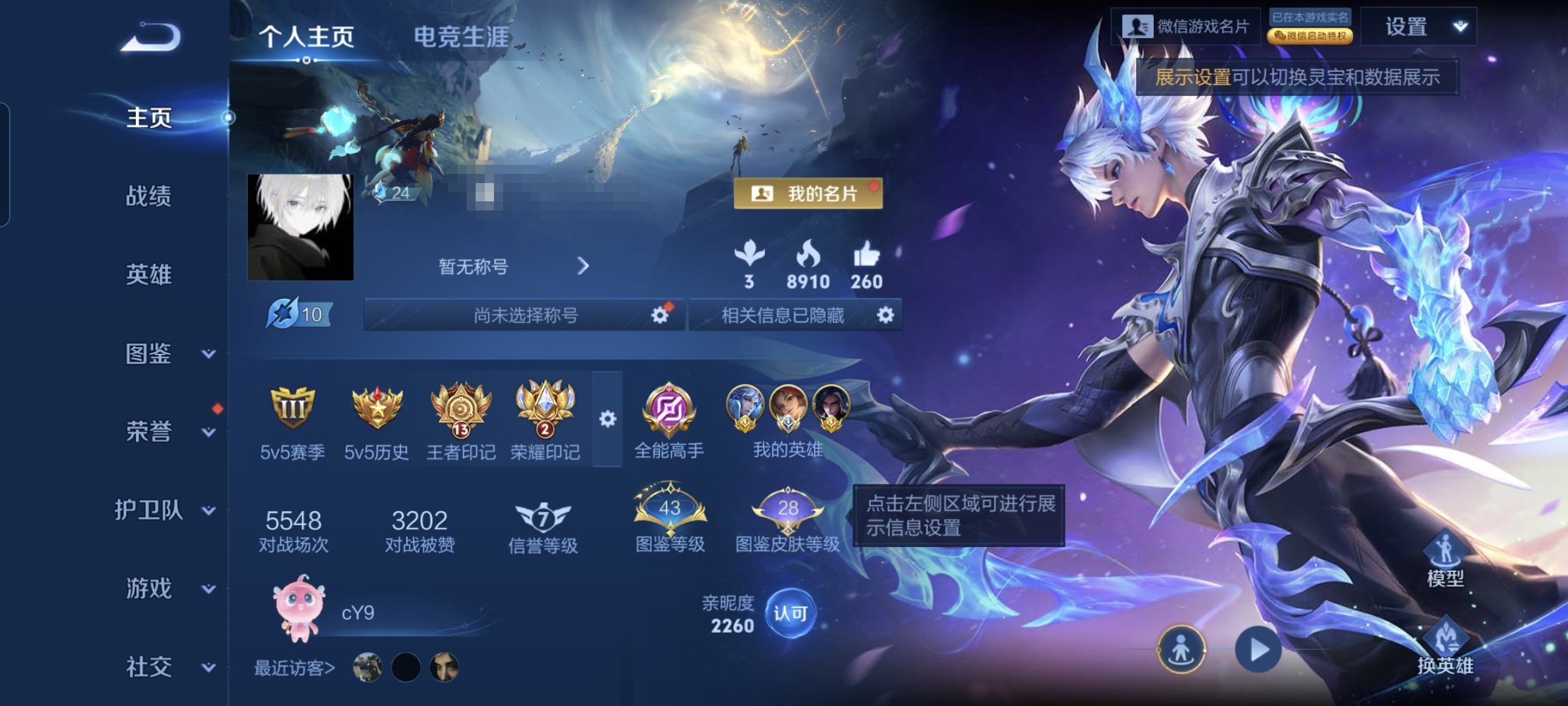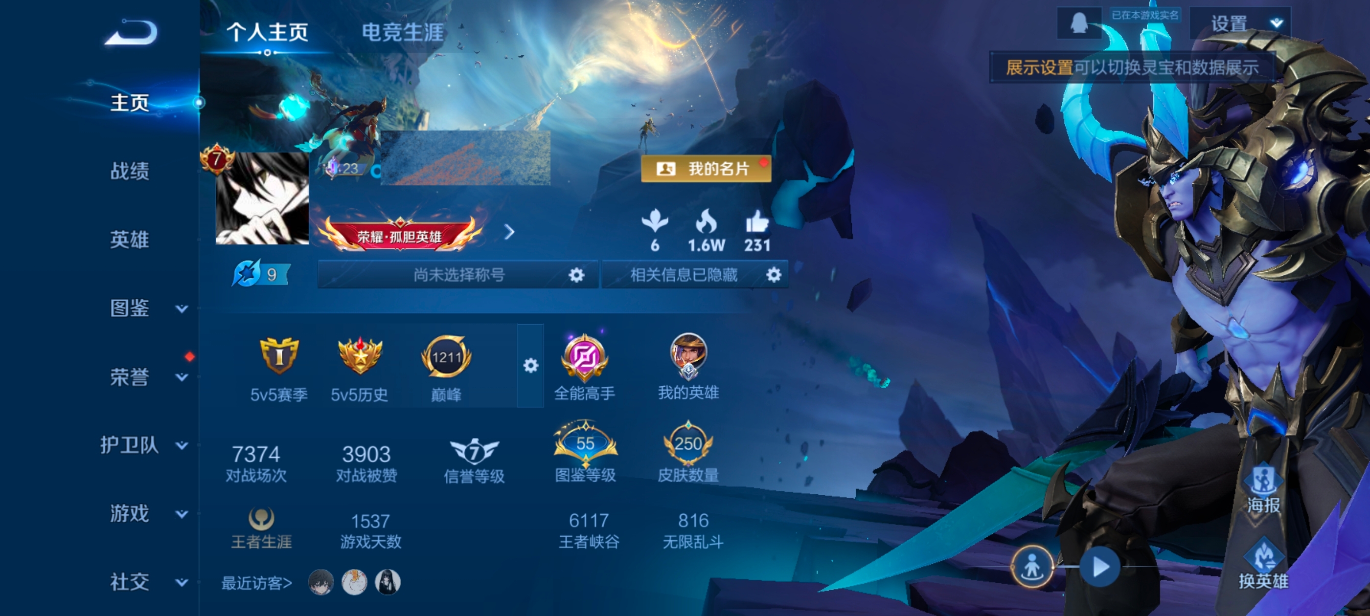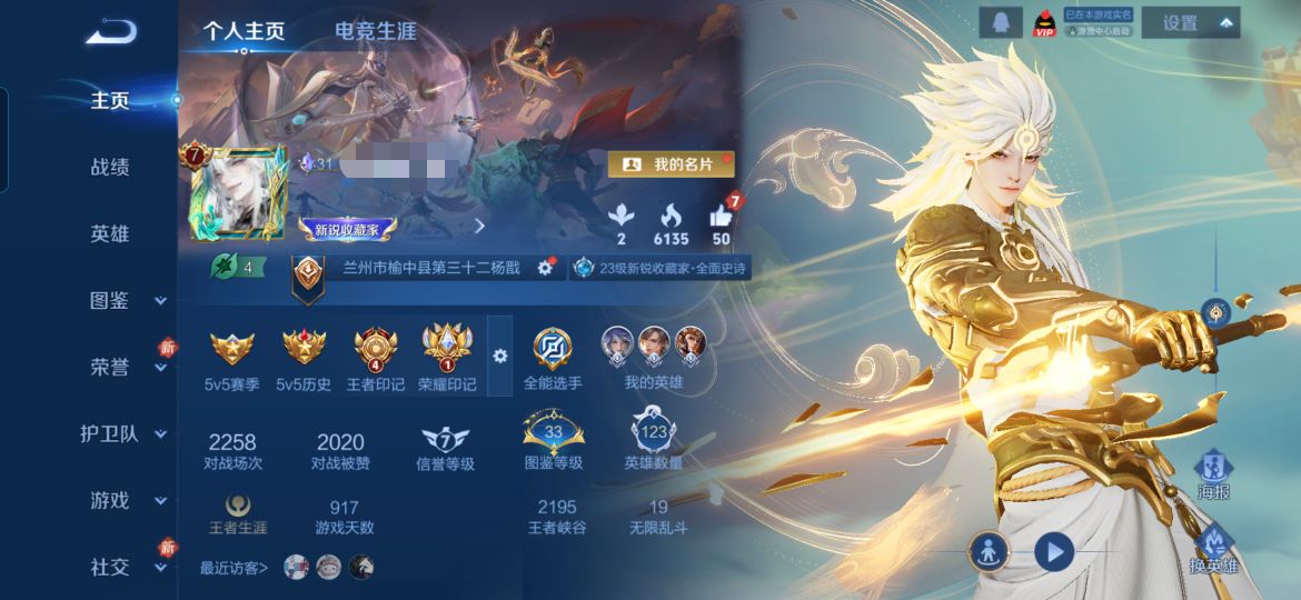 实名: 可修改 贵族等级: V5 英雄数: 123 皮肤数: 161 传说皮: