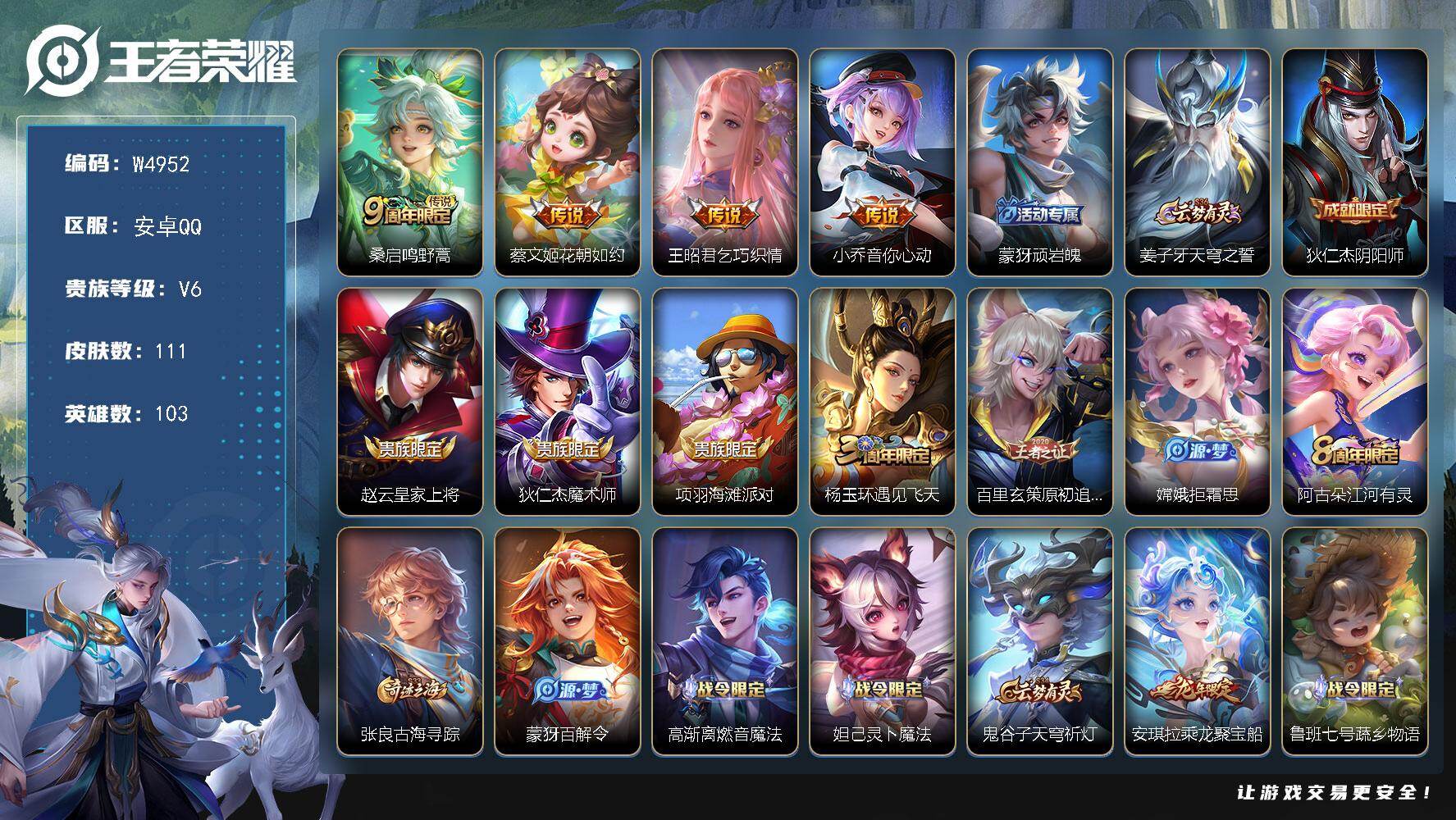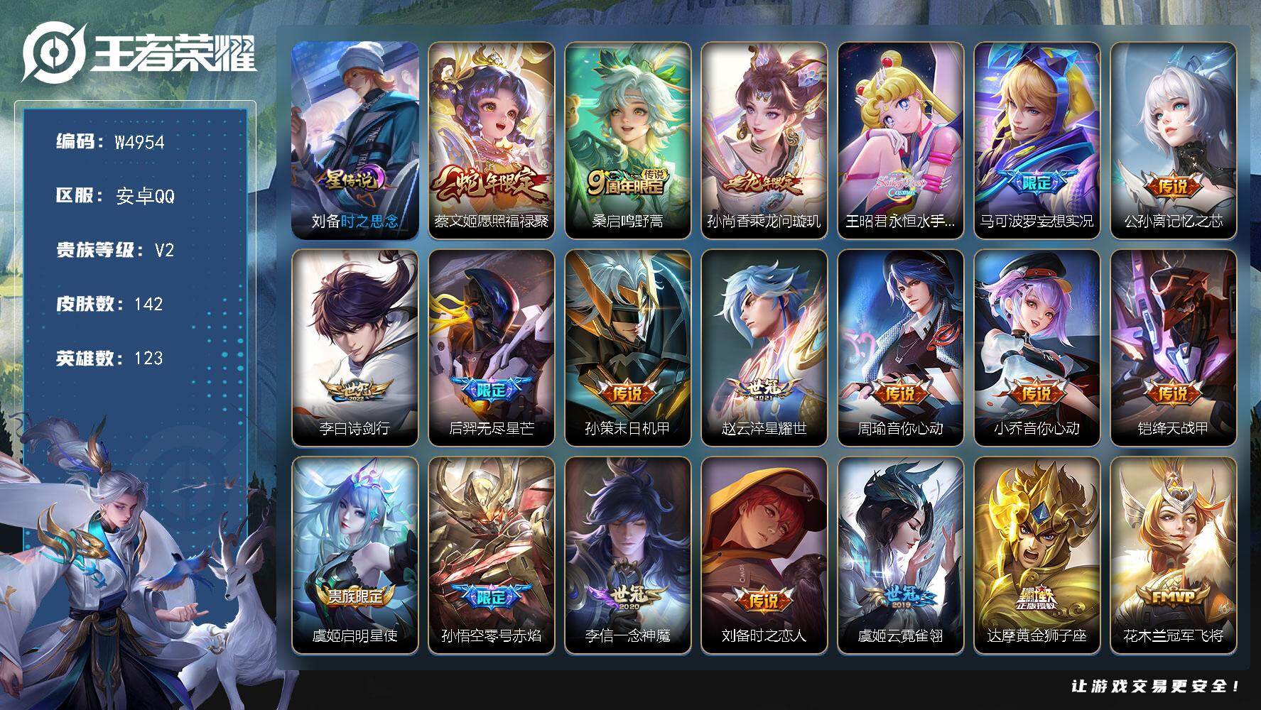 【W4954】安卓Q区-无二次-贵8-123英雄-142皮肤-21传说-47史
