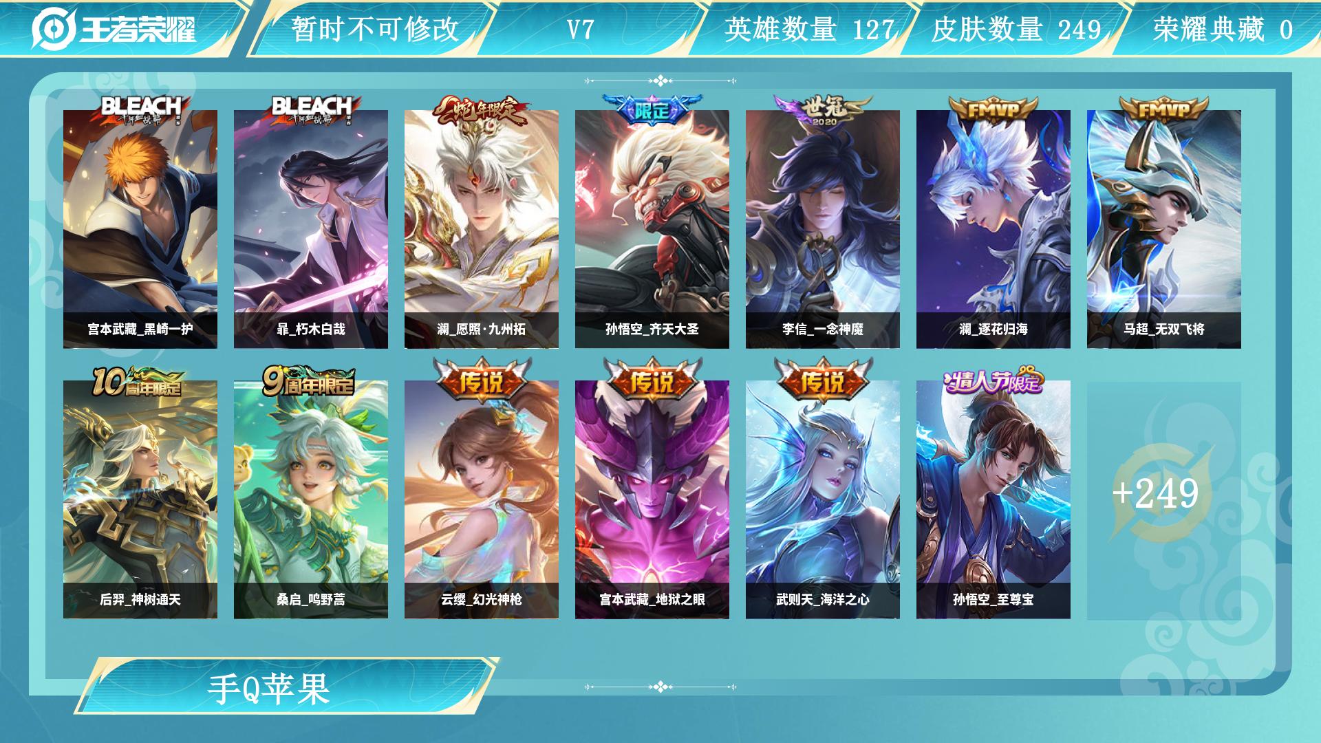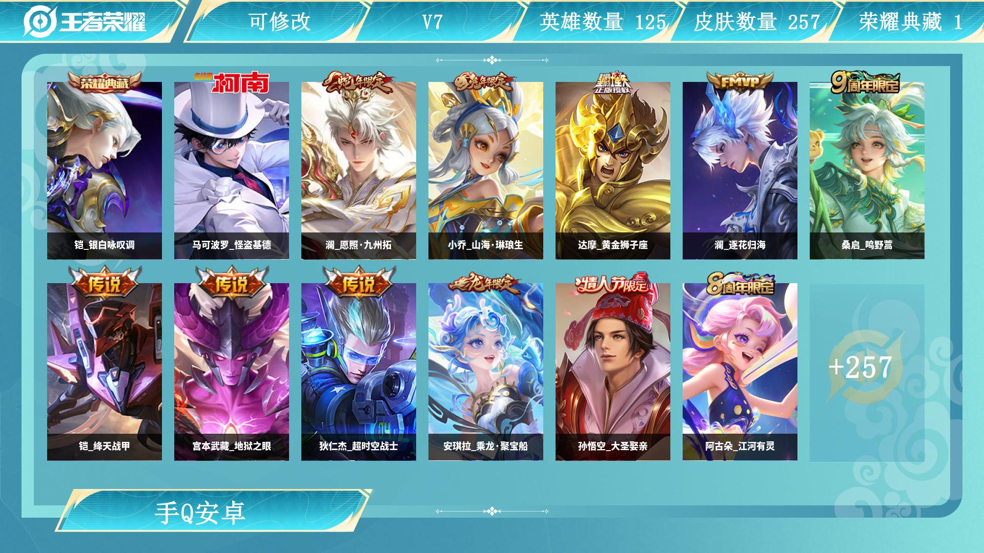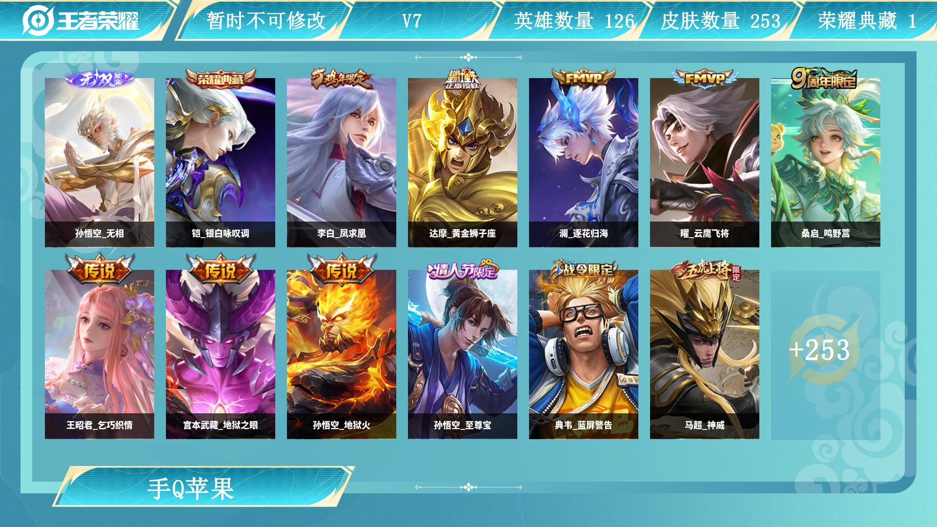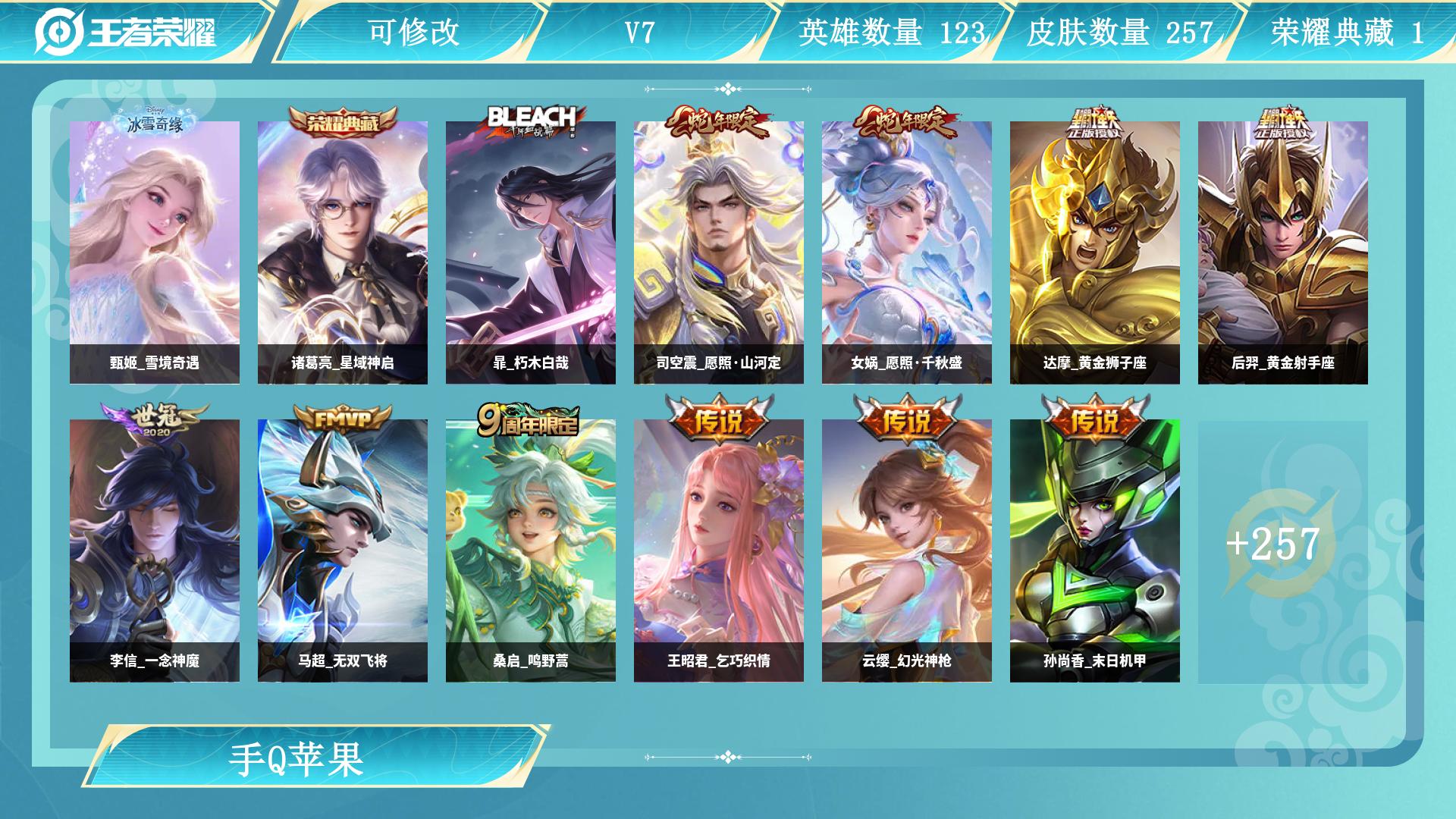 皮肤数量257印记总数11V7绝世王者可修改账号类型3荣耀典