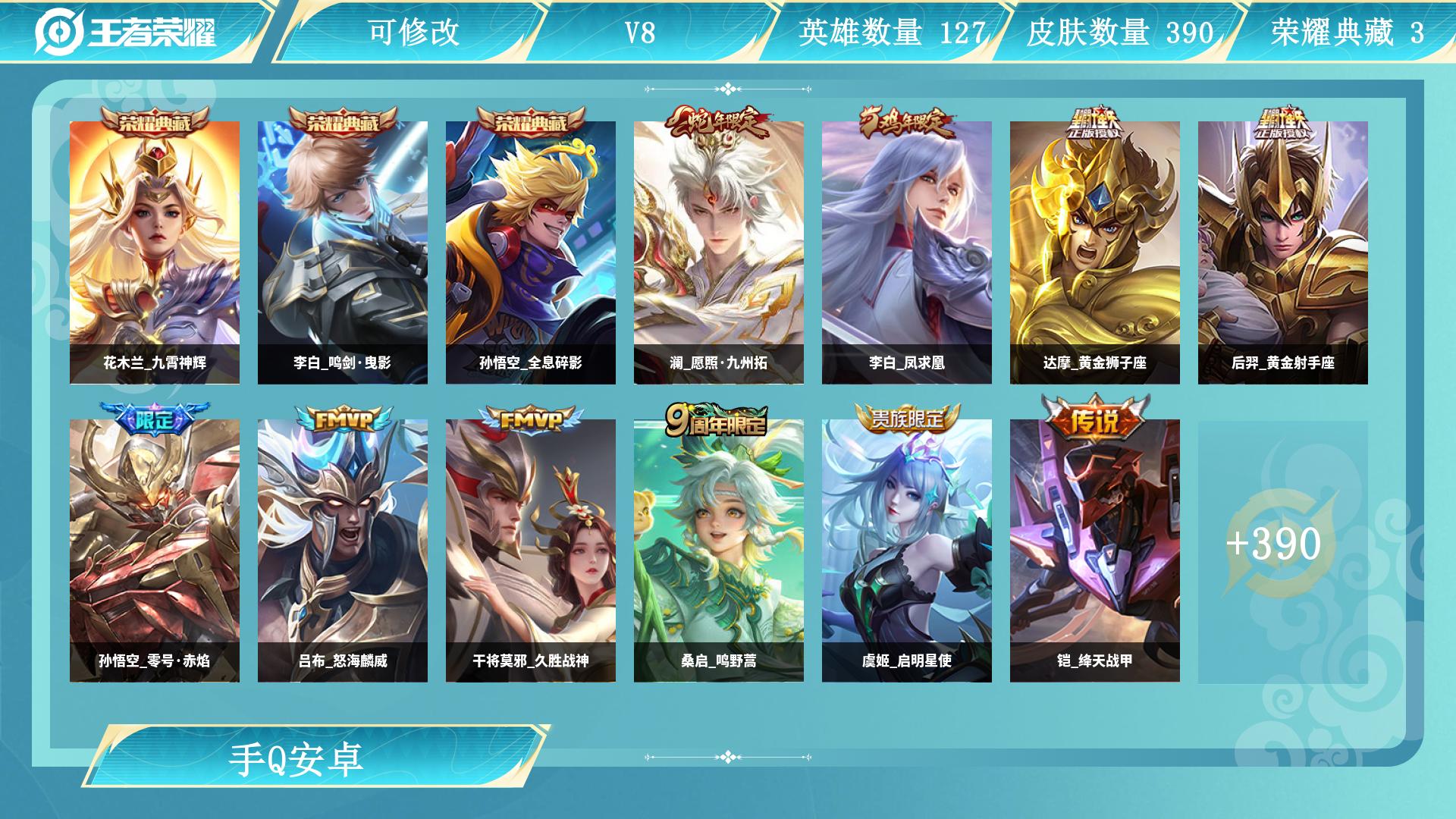 皮肤数量390印记总数29V8非凡王者可修改账号类型2荣耀典