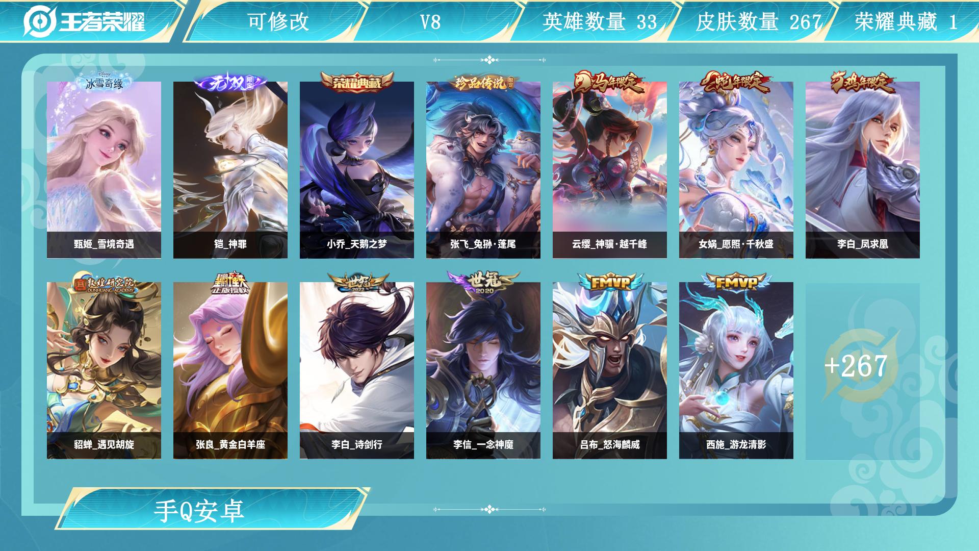 皮肤数量267印记总数16V8荣耀黄金可修改账号类型3无双2