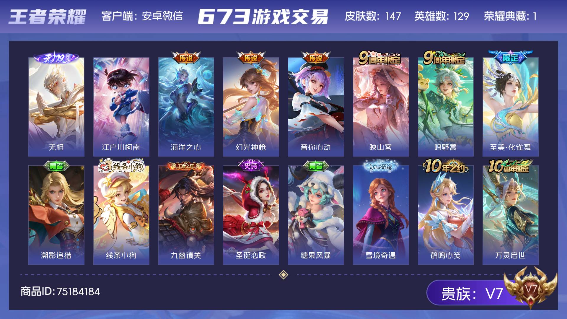 V7 皮肤147 英雄129 永恒钻石 荣耀典藏1 无双皮肤1 珍品传说1 星传说1 传说6 其他皮肤144