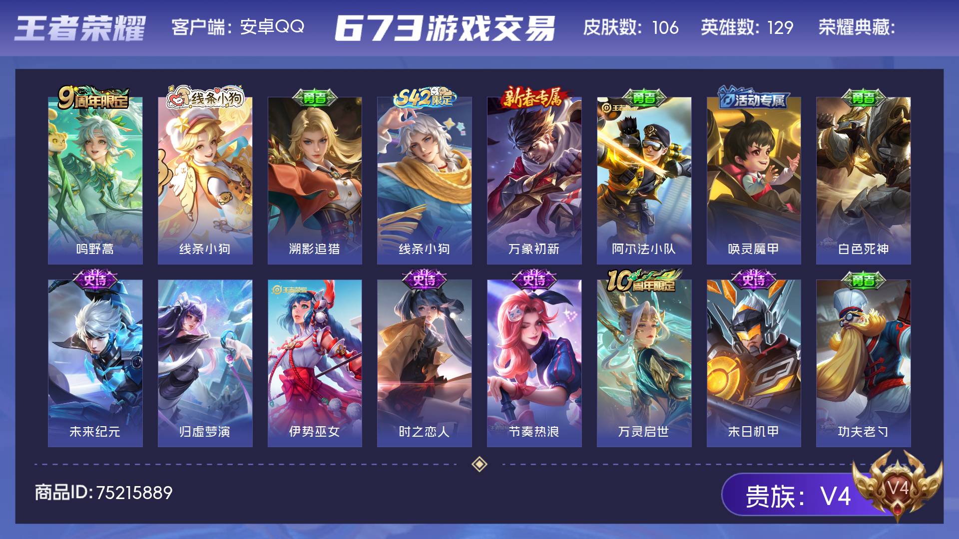 V4 皮肤106 英雄129 尊贵铂金 传说1 其他皮肤110