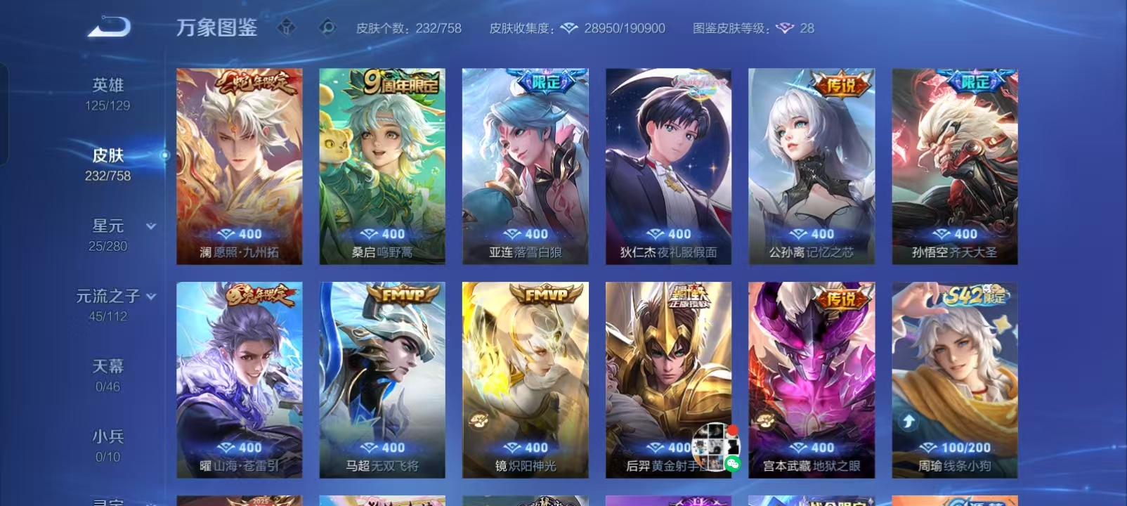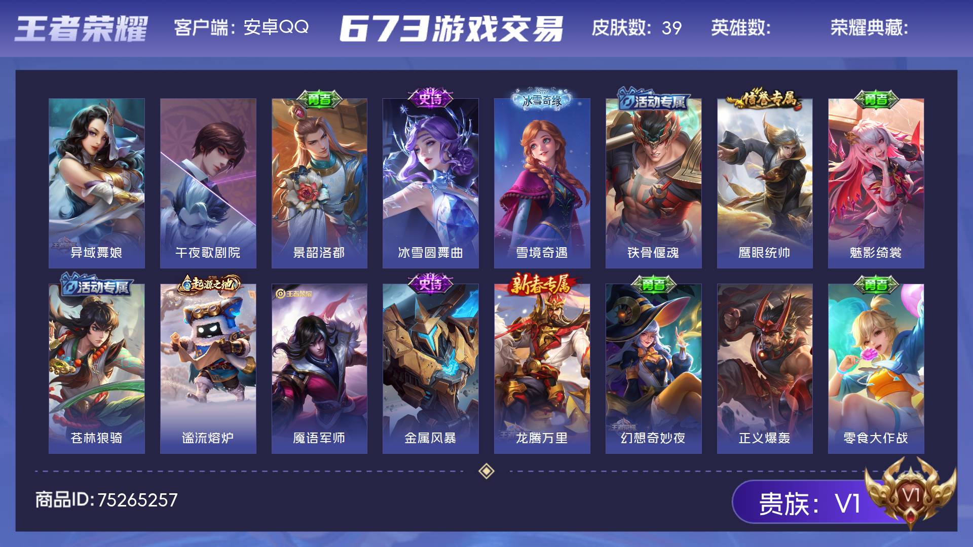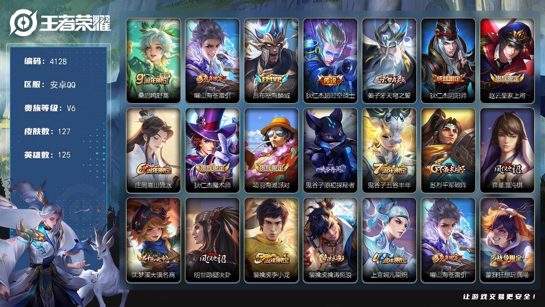 安卓Q-V6-至尊星耀IV段位-125英雄-127皮肤-4传说-41史诗【英