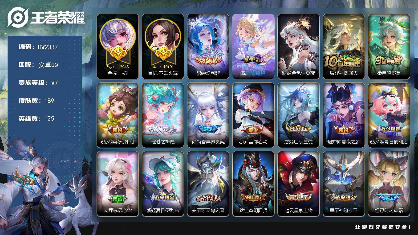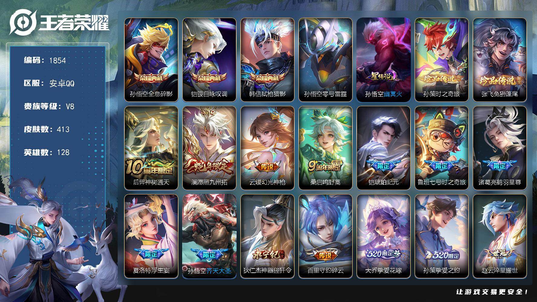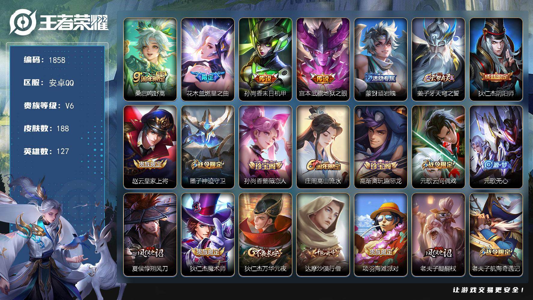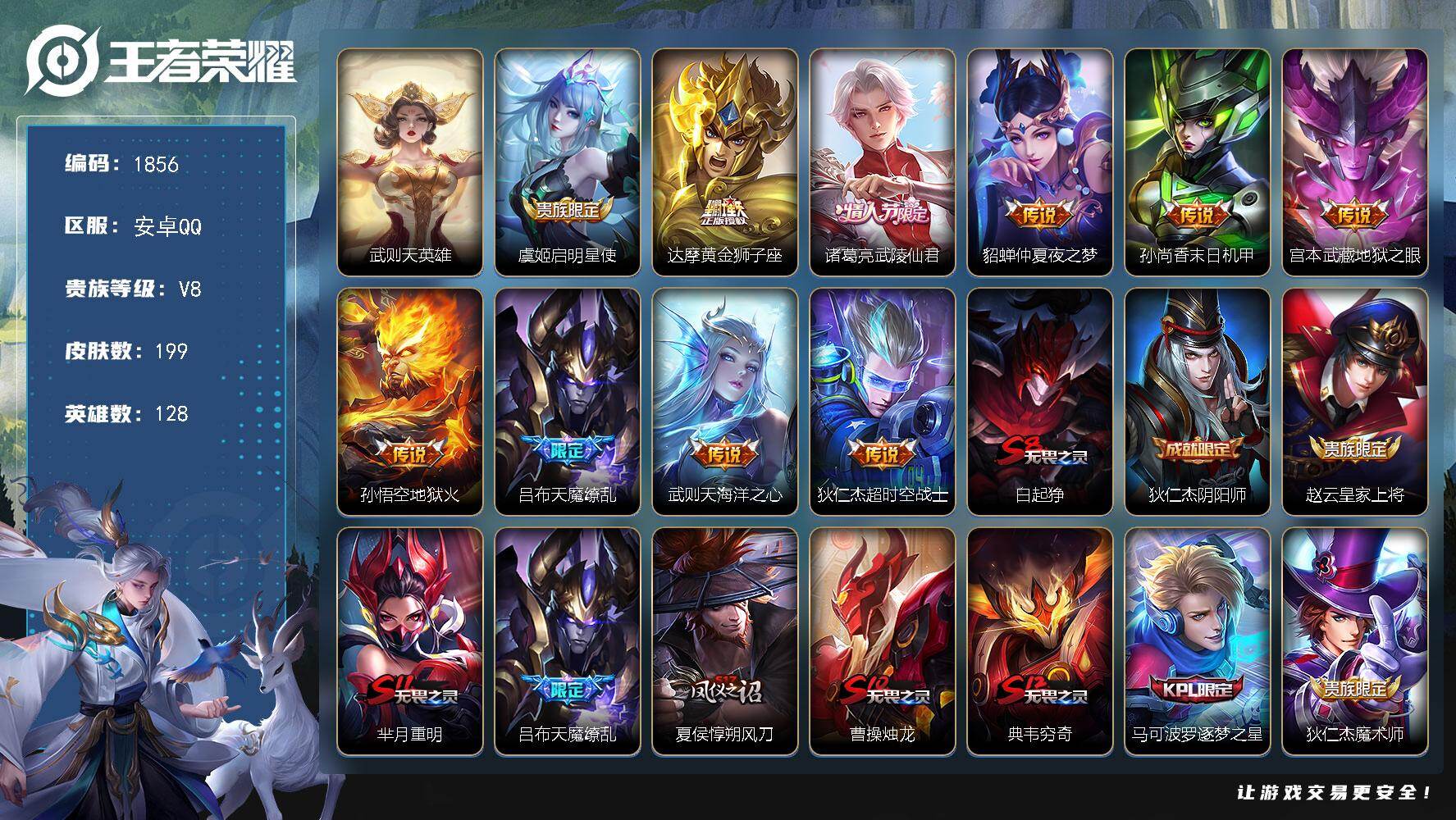 安卓Q-V6-永恒钻石I段位-127英雄-150皮肤-8传说-50史诗【英雄