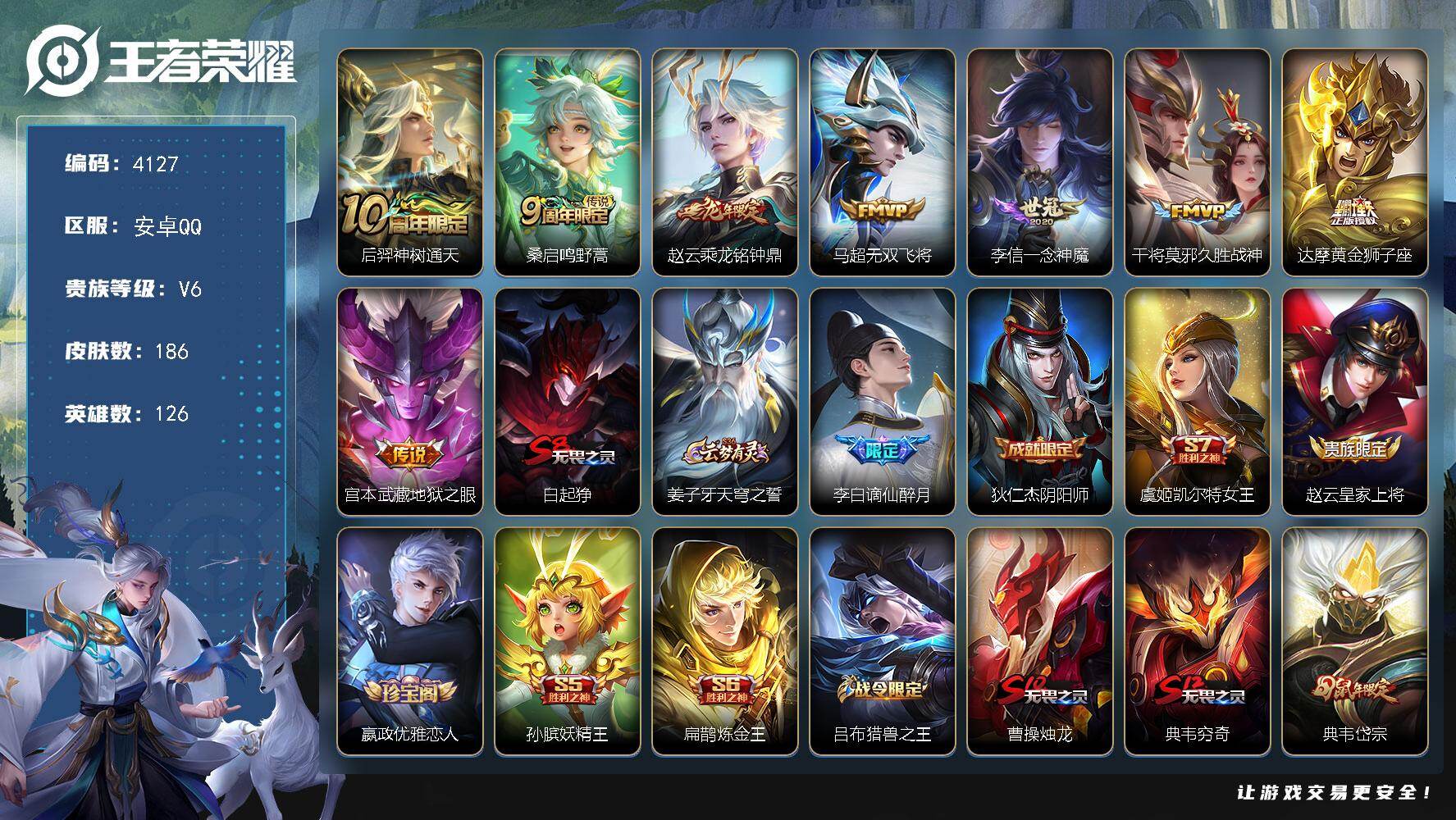 安卓Q-V5-至尊星耀V段位-126英雄-186皮肤-8传说-47史诗【传说