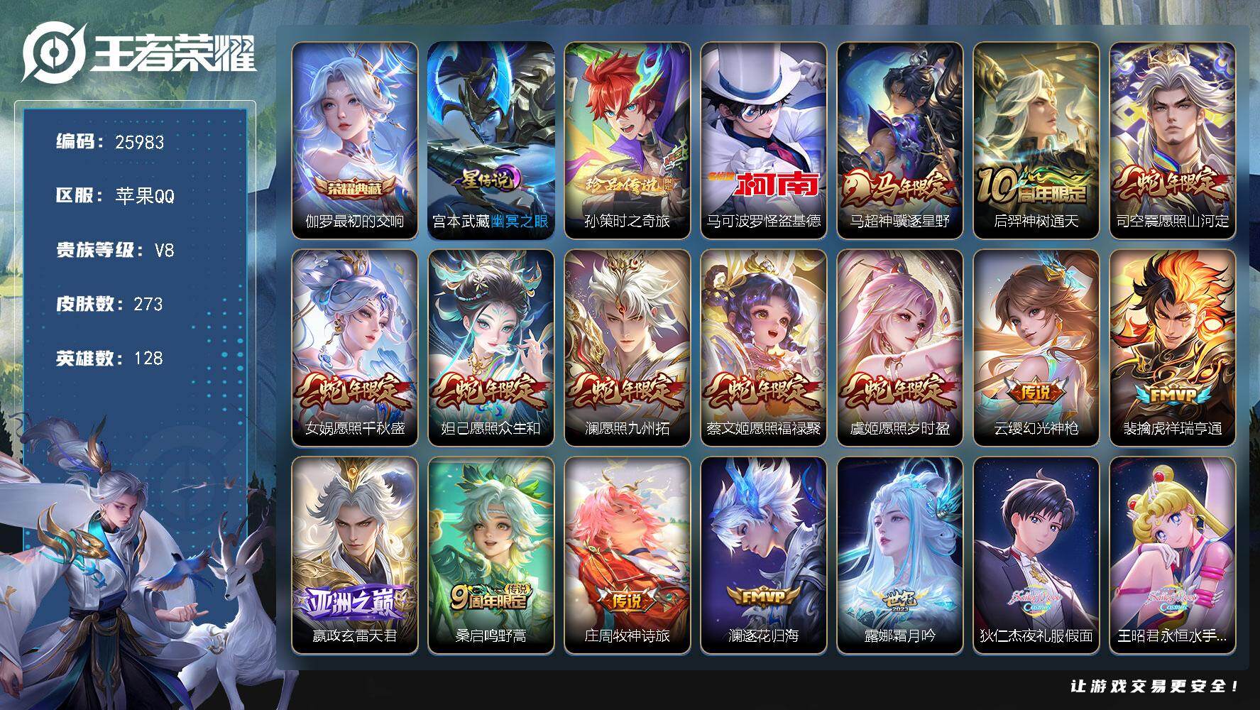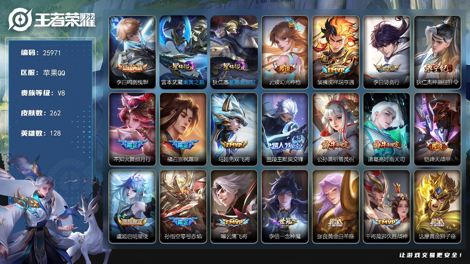 【秒换绑】苹果Q-V8-最强王者段位-128英雄-192皮肤-1典藏皮肤-2无