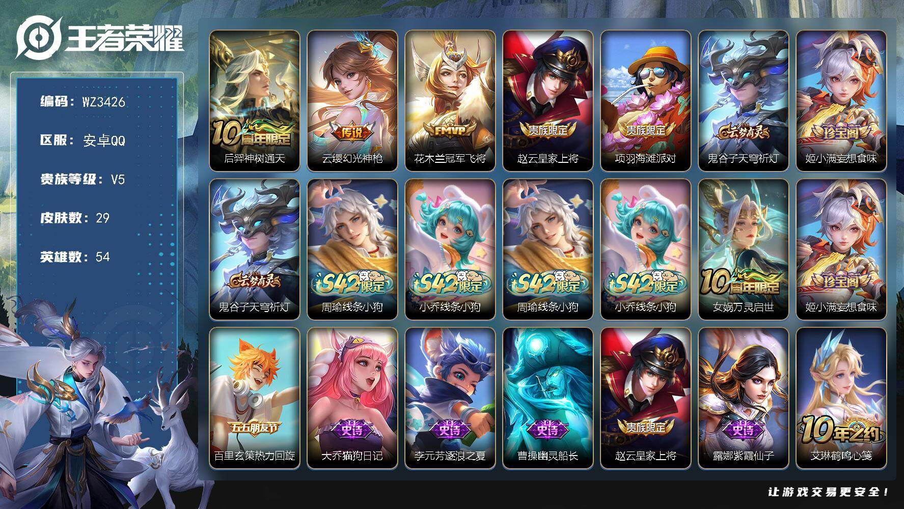 【秒换绑】安卓Q-V5-永恒钻石IV段位-54英雄-29皮肤-3传说-9史诗