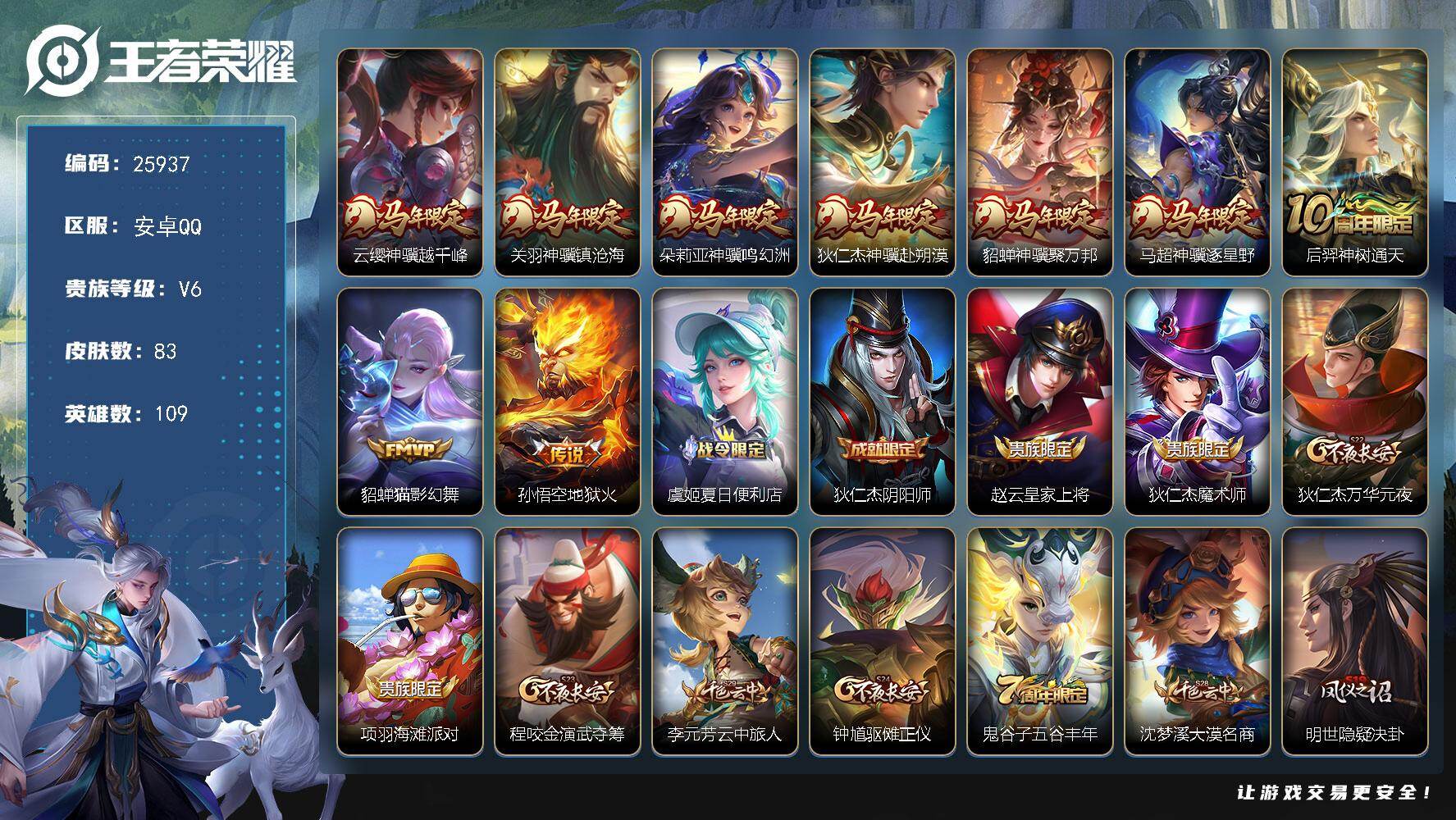 【秒换绑】安卓Q-V5-最强王者段位-91英雄-68皮肤-1无双-3传说-13