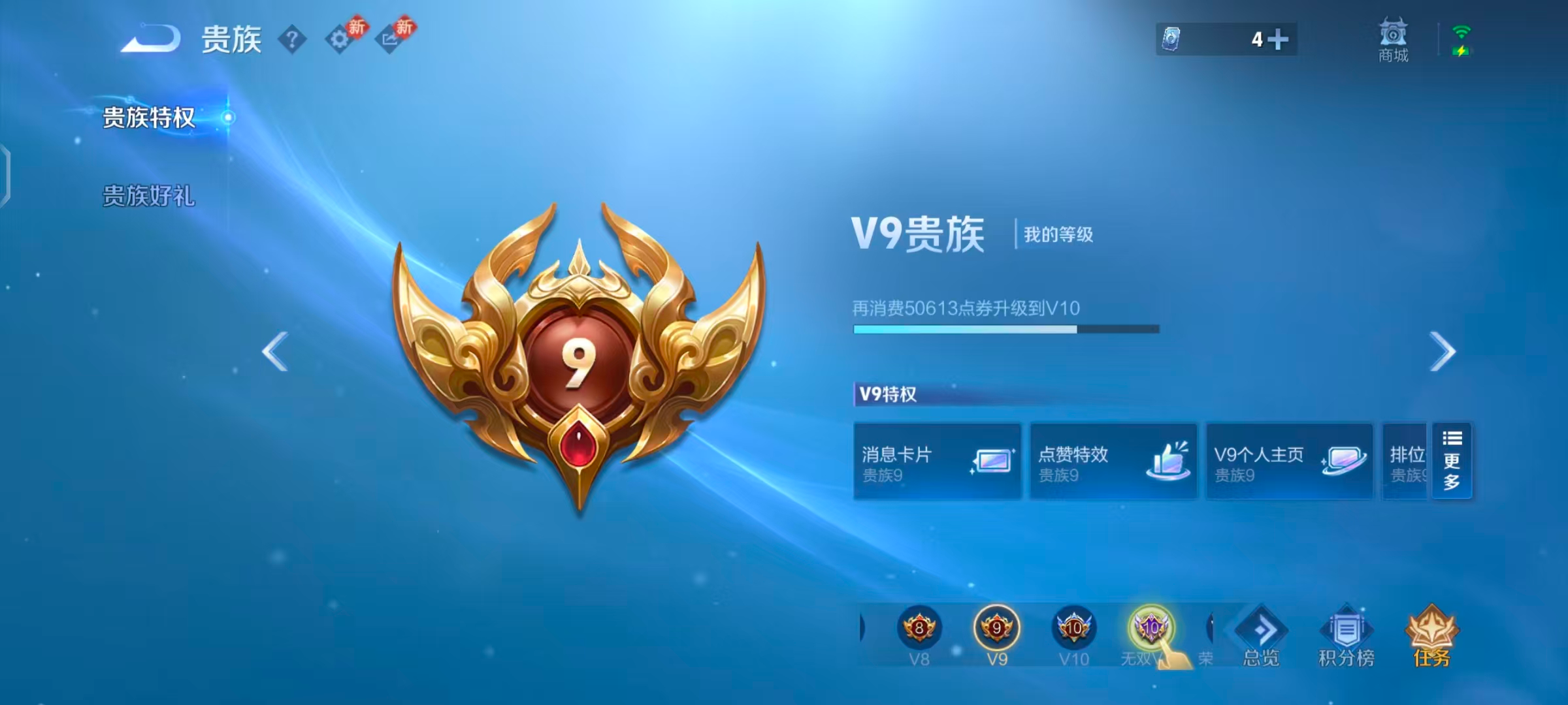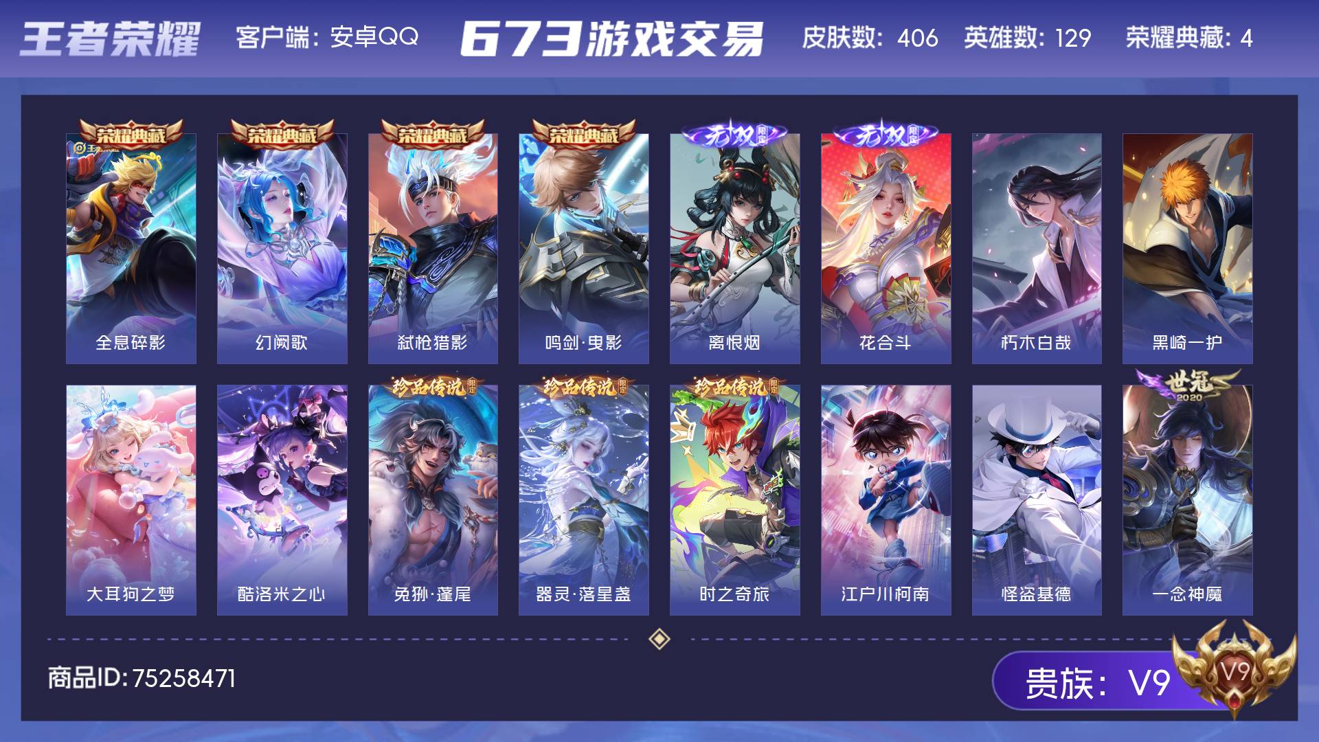 V9 皮肤406 英雄129 永恒钻石 荣耀典藏4 无双皮肤2 珍品传说9 传说48 其他皮肤347