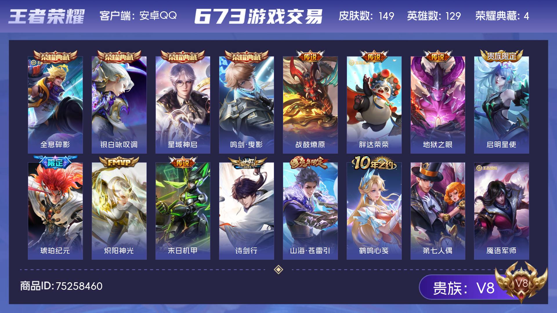 V8 皮肤149 英雄129 荣耀黄金 荣耀典藏4 传说9 其他皮肤142