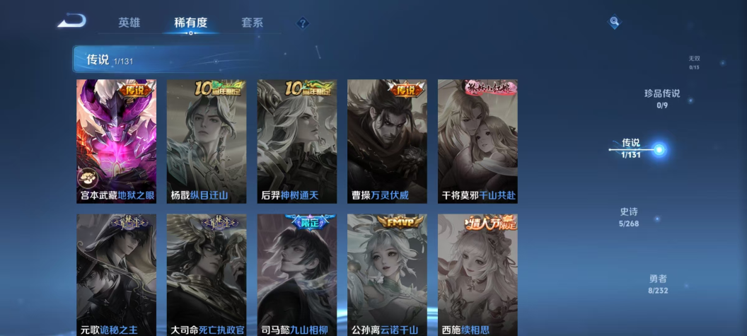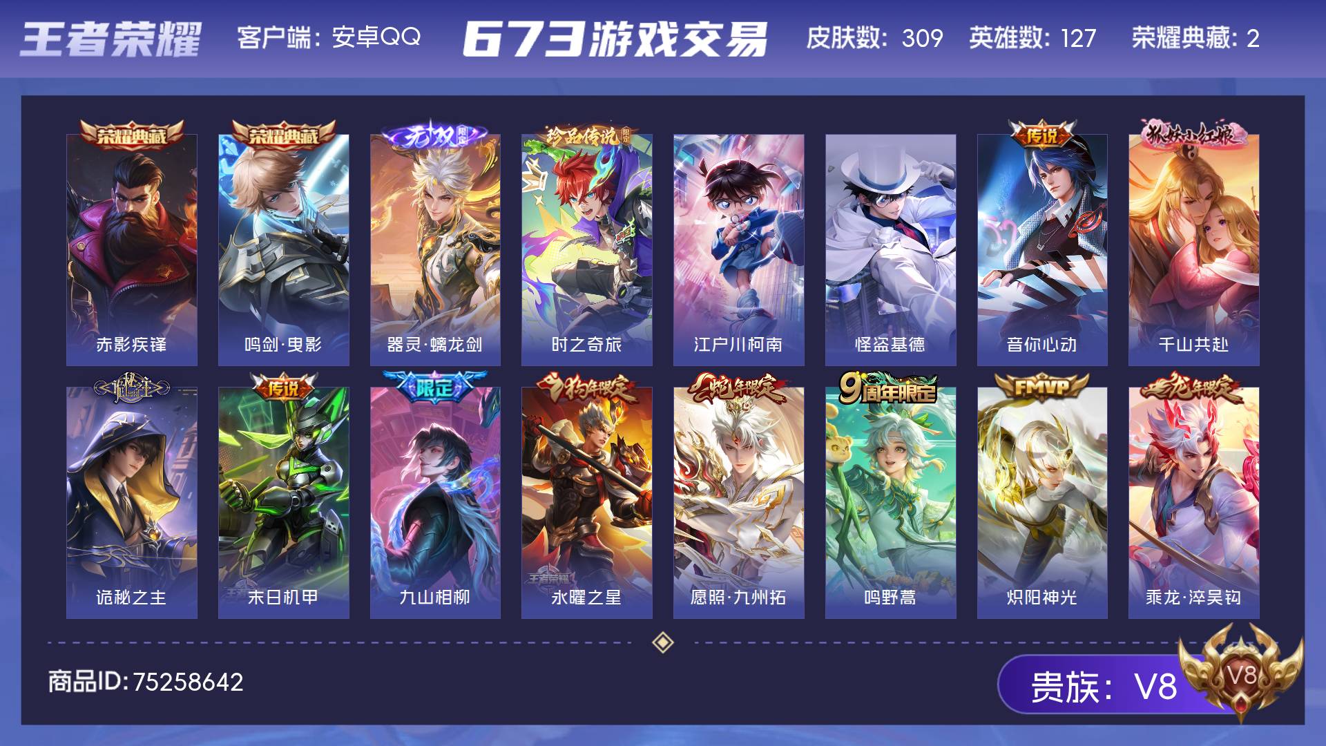 V8 皮肤309 英雄127 至尊星耀 荣耀典藏2 无双皮肤1 珍品传说3 传说30 其他皮肤278