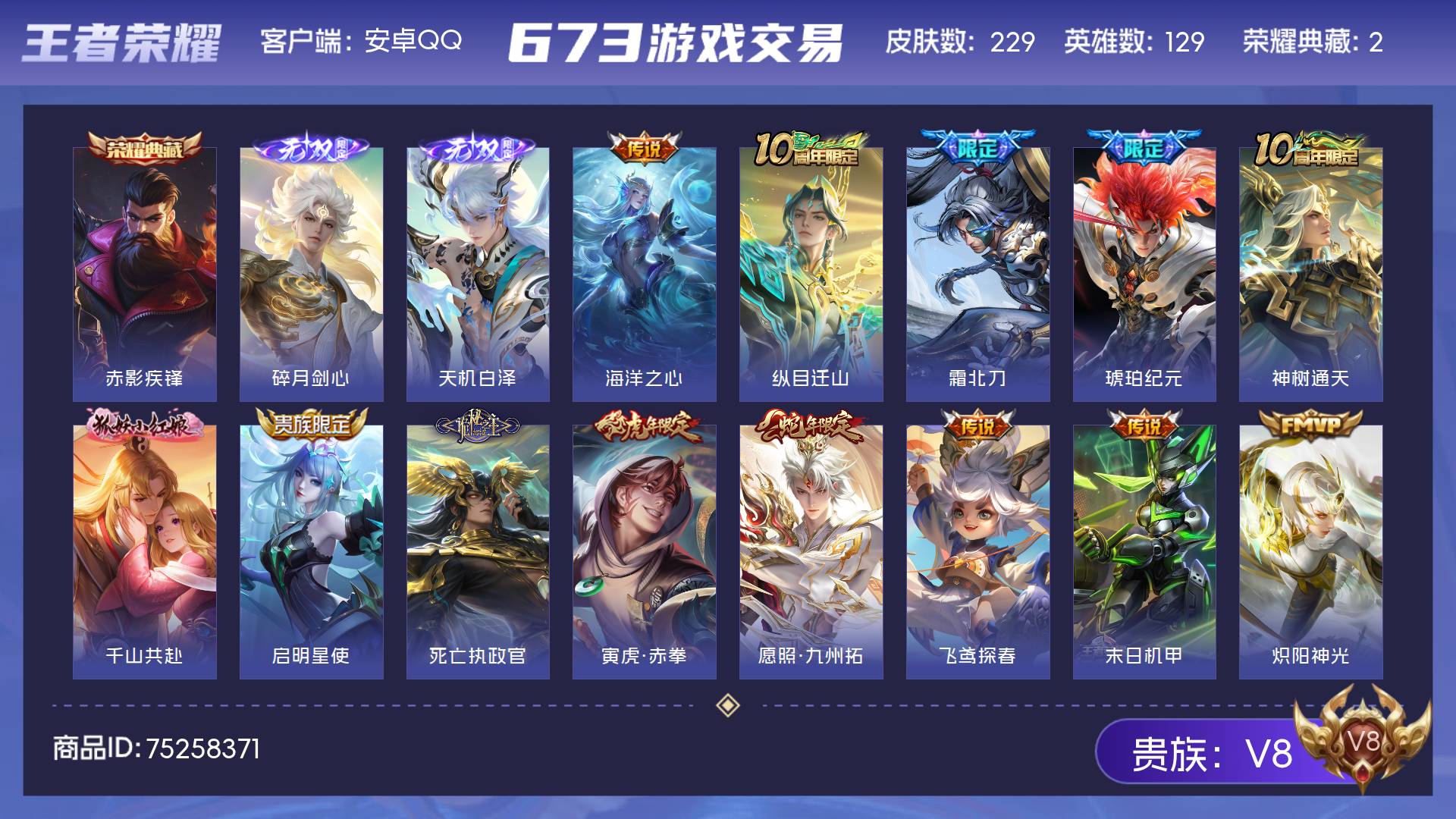V8 皮肤229 英雄129 至尊星耀 荣耀典藏2 无双皮肤2 传说24 其他皮肤207