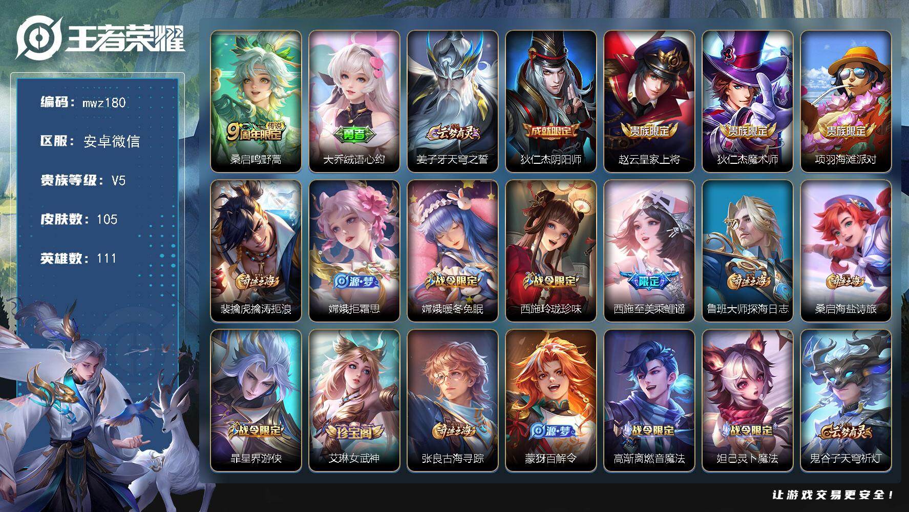 安卓WX-V5-最强王者段位-111英雄-105皮肤-1传说-36史诗【英雄