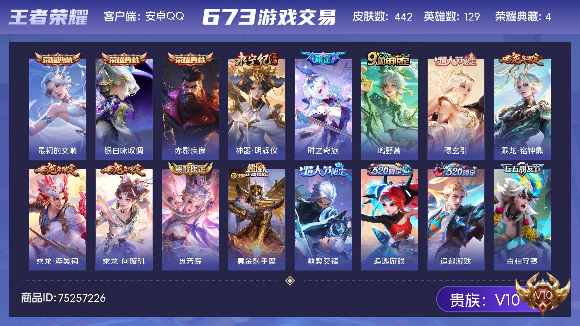 V10 皮肤442 英雄129 至尊星耀 荣耀典藏4 无双皮肤1 传说36 其他皮肤407