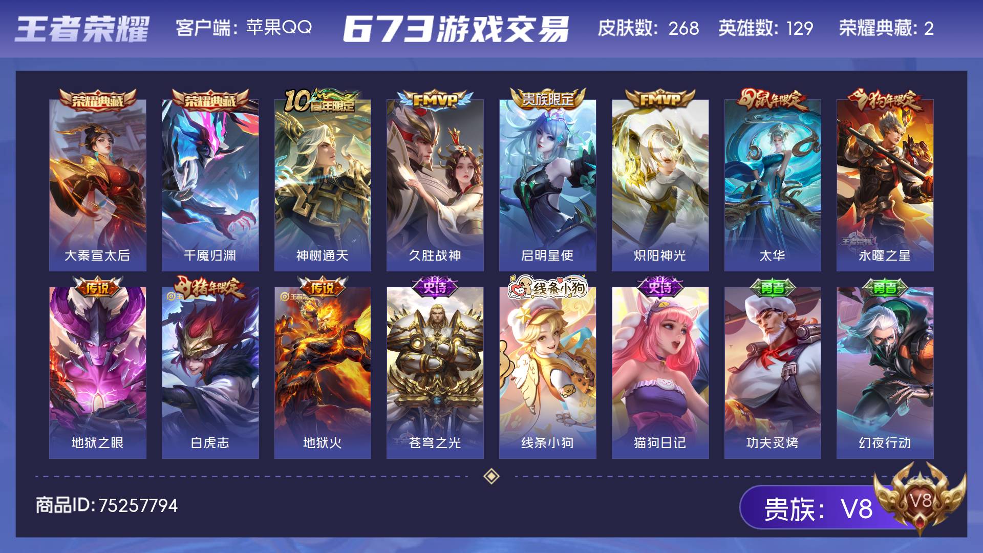 V8 皮肤268 英雄129 至尊星耀 荣耀典藏2 传说9 其他皮肤263