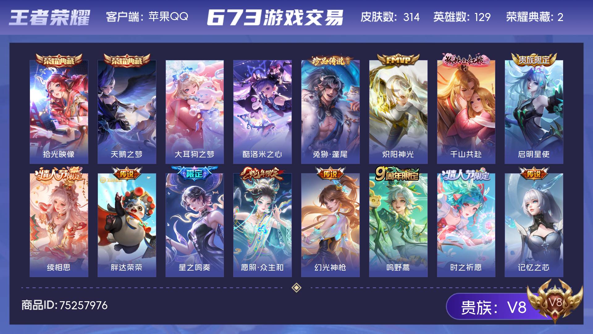 V8 皮肤314 英雄129 尊贵铂金 荣耀典藏2 珍品传说3 传说15 其他皮肤300