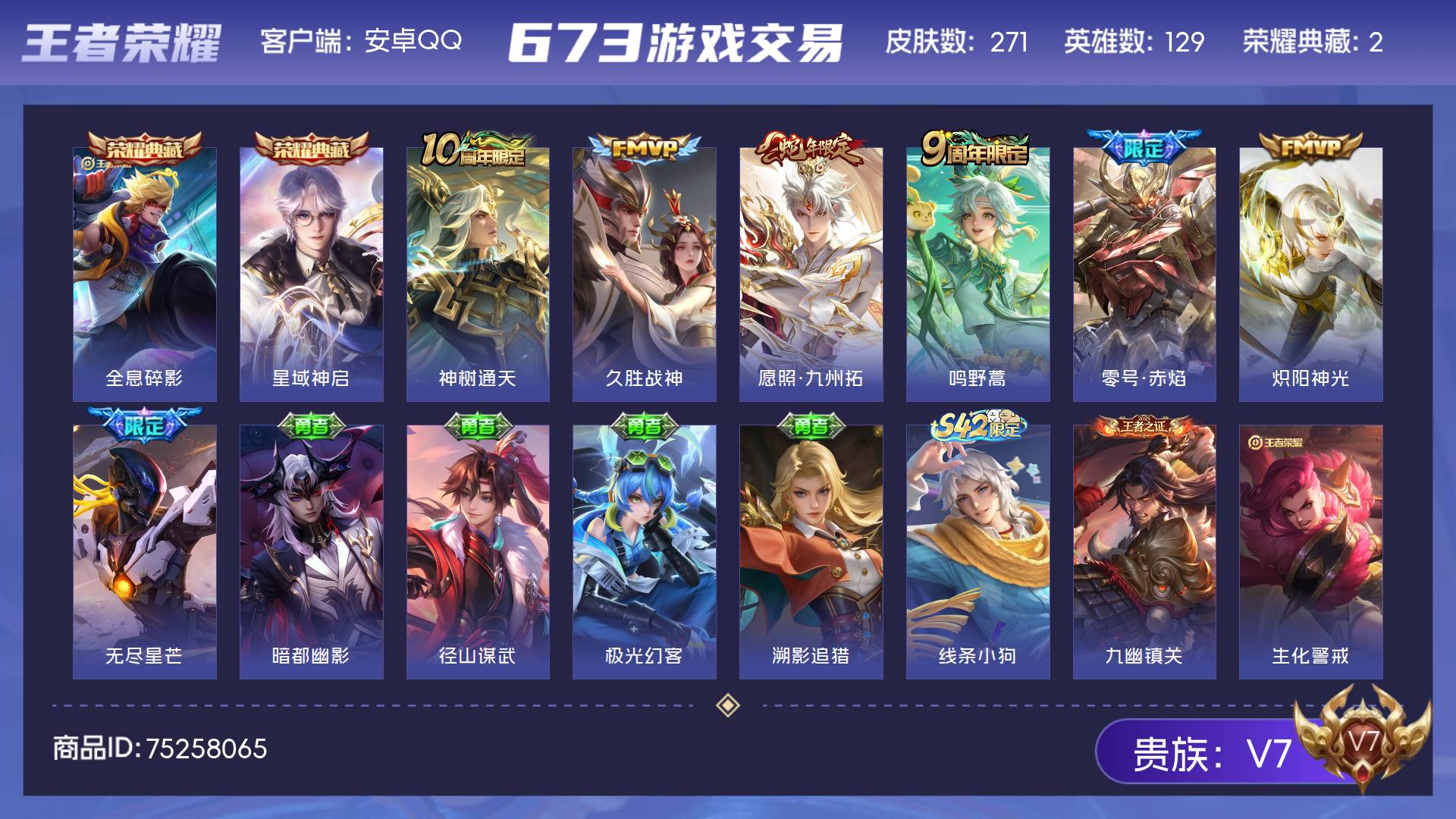 V7 皮肤271 英雄129 永恒钻石 荣耀典藏2 传说7 其他皮肤266