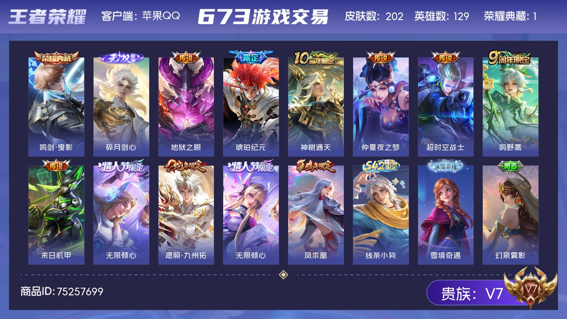 V7 皮肤202 英雄129 永恒钻石 荣耀典藏1 无双皮肤1 传说11 其他皮肤194