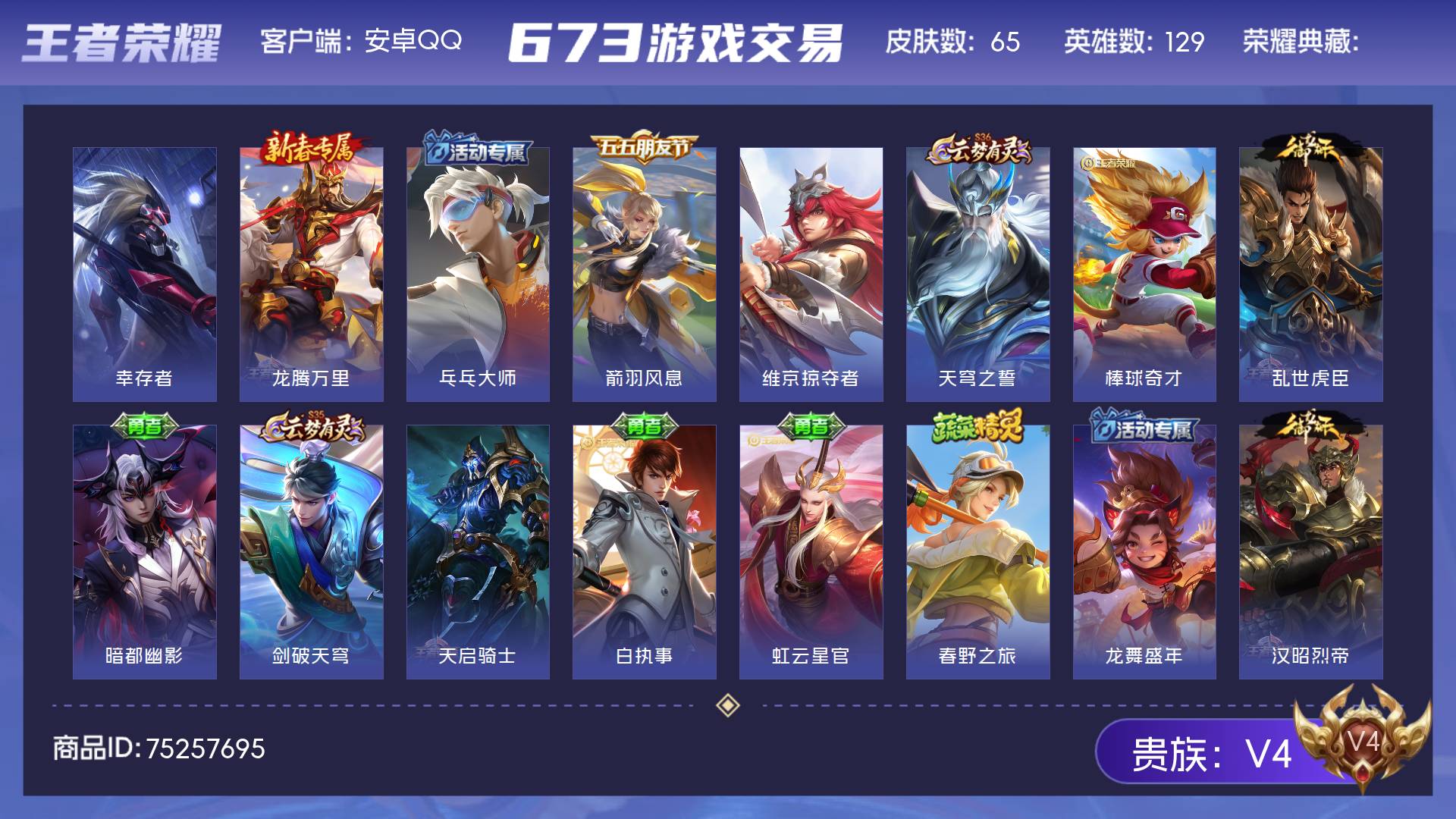 V4 皮肤65 英雄129 永恒钻石 其他皮肤70