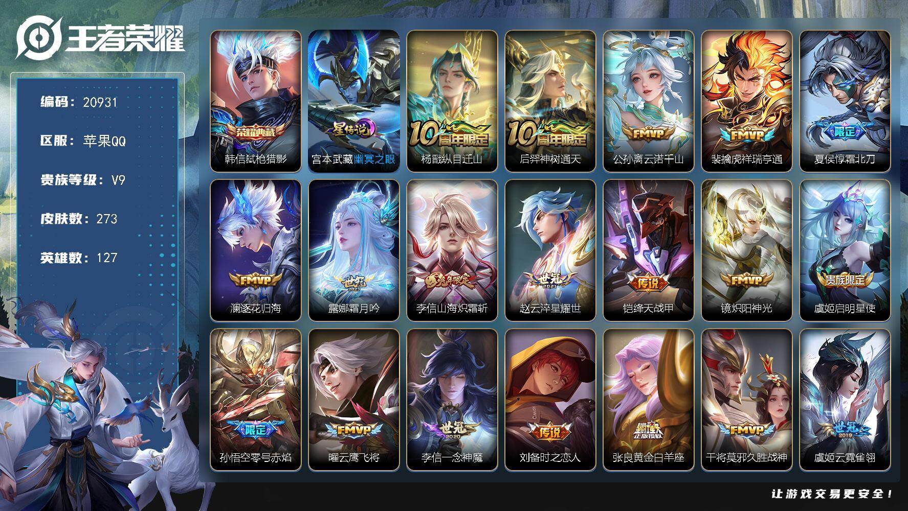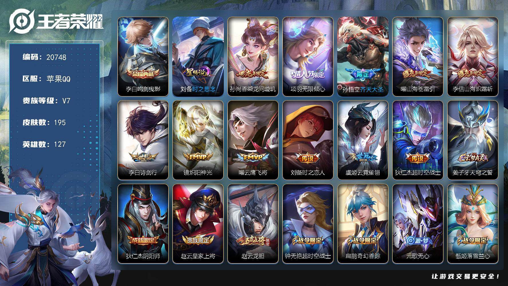 【特价出售/店主推荐】苹果Q-V7-最强王者段位-126英雄-230皮肤-1典