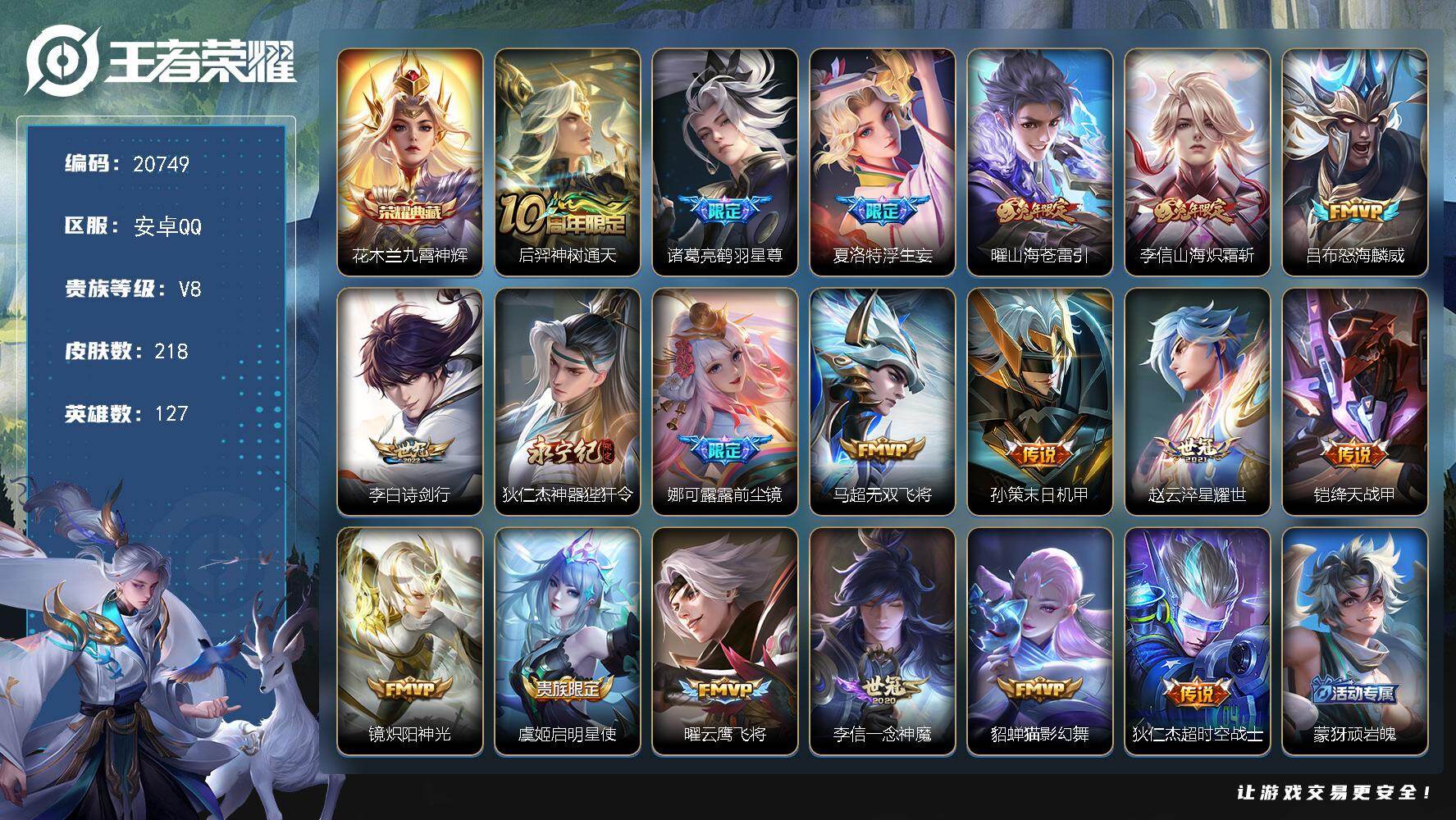 可换绑【V8精品打野战士号 对抗路41段 花木兰典藏 浮生妄 前尘镜 神威 多