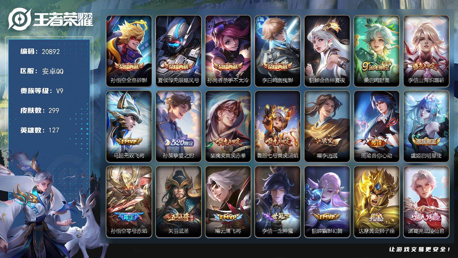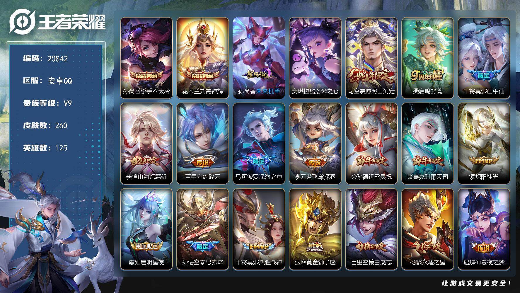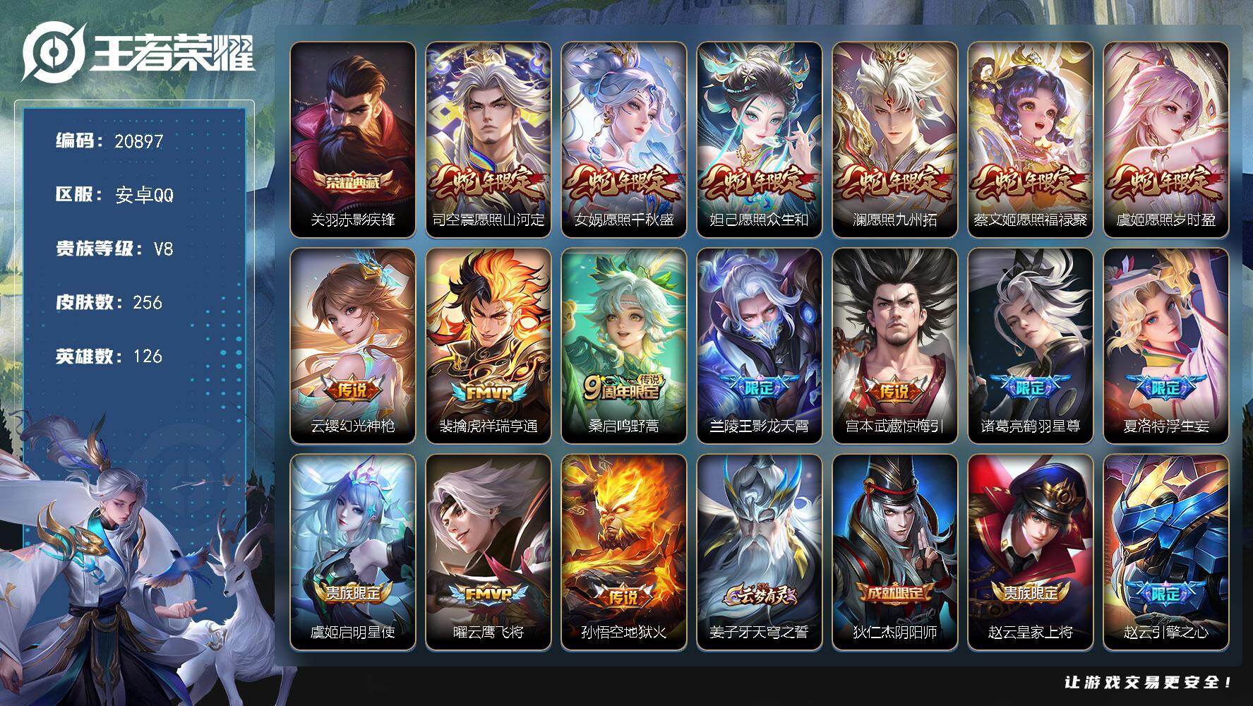 可换绑【V9精品打野射手号 发育路46段 双典藏 祈雪灵祝 狗年杨戬 白虎志