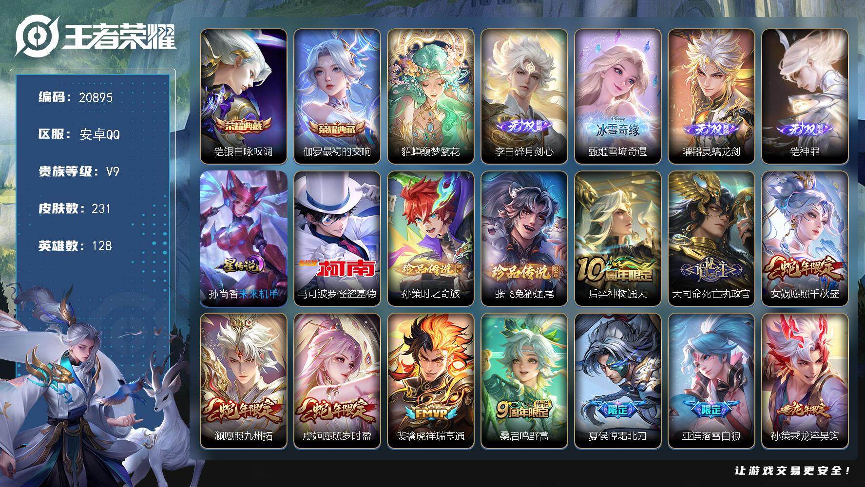 2金标,2星传说,星币3100,安卓Q-V7--128英雄-190皮肤-1典藏
