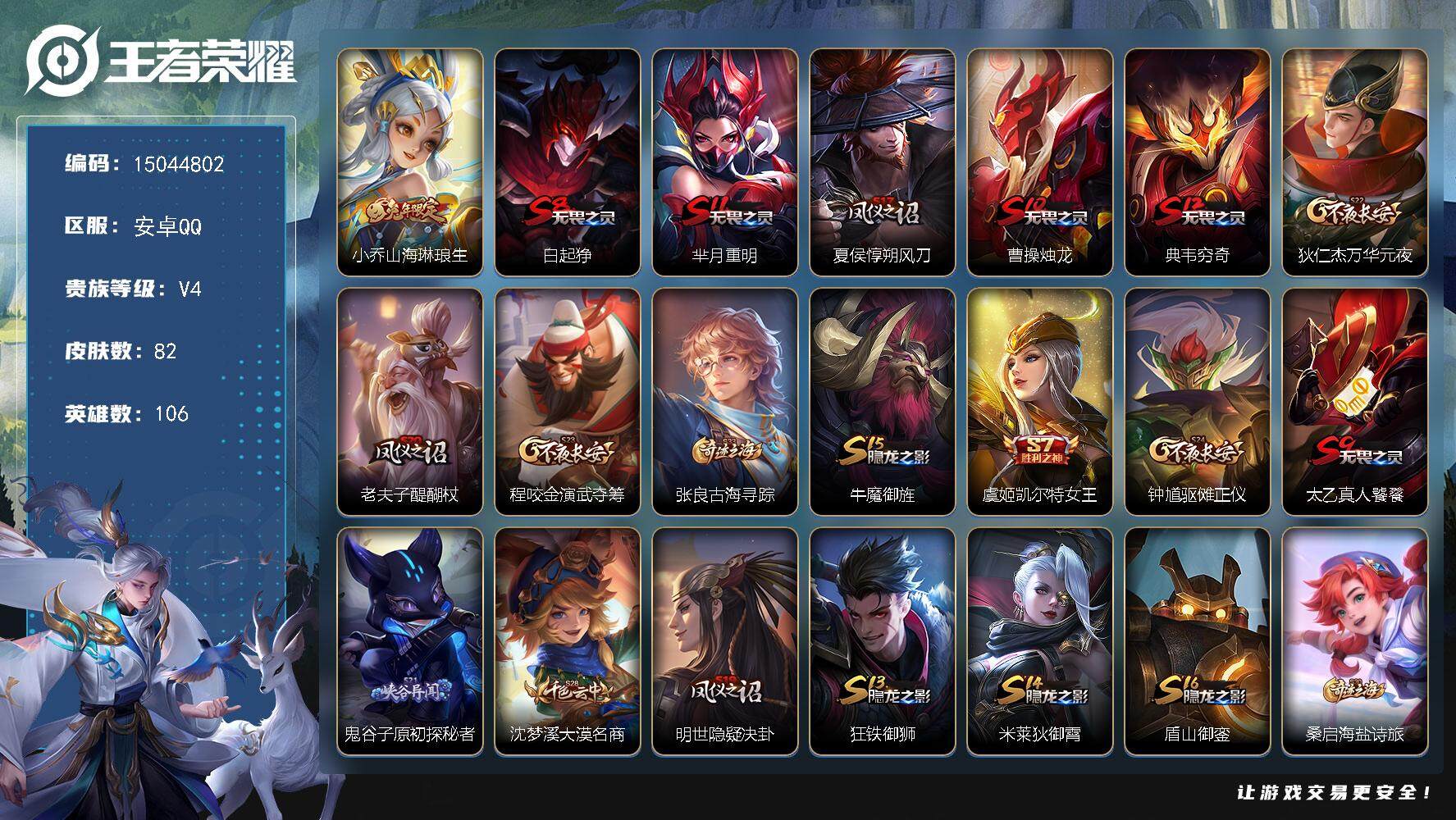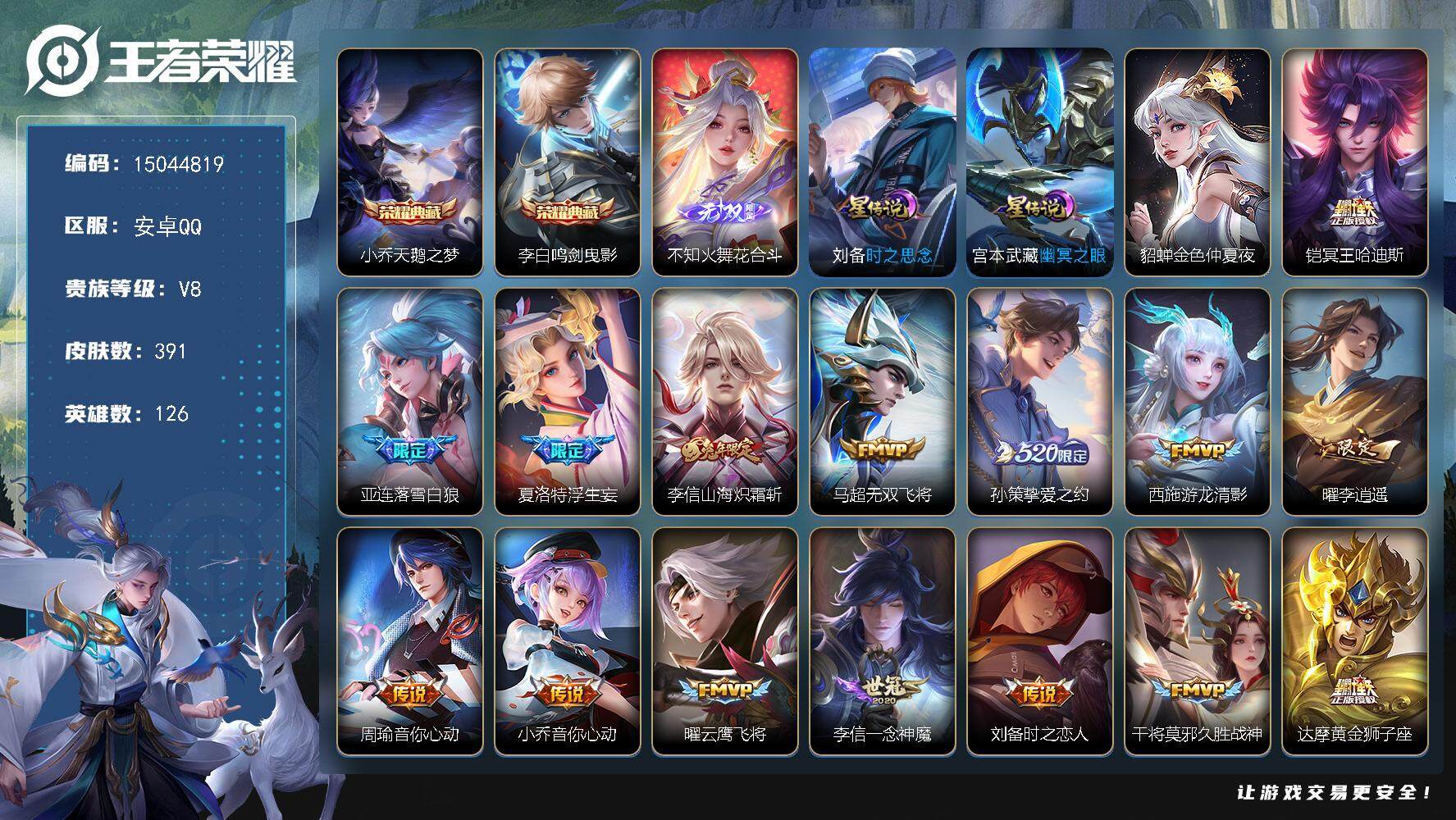 安卓QQ-6典藏-94传说-6无双-637皮肤-128英雄-荣耀王者-荣耀王者 V10无双贵族 5典藏637皮 天鹅之梦/纯白花嫁/天魔缭乱/至尊宝/圣诞老人/白虎志