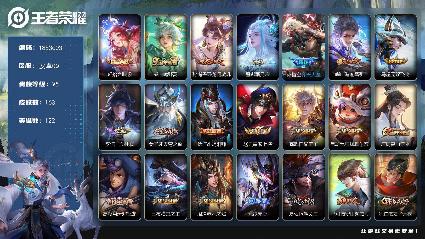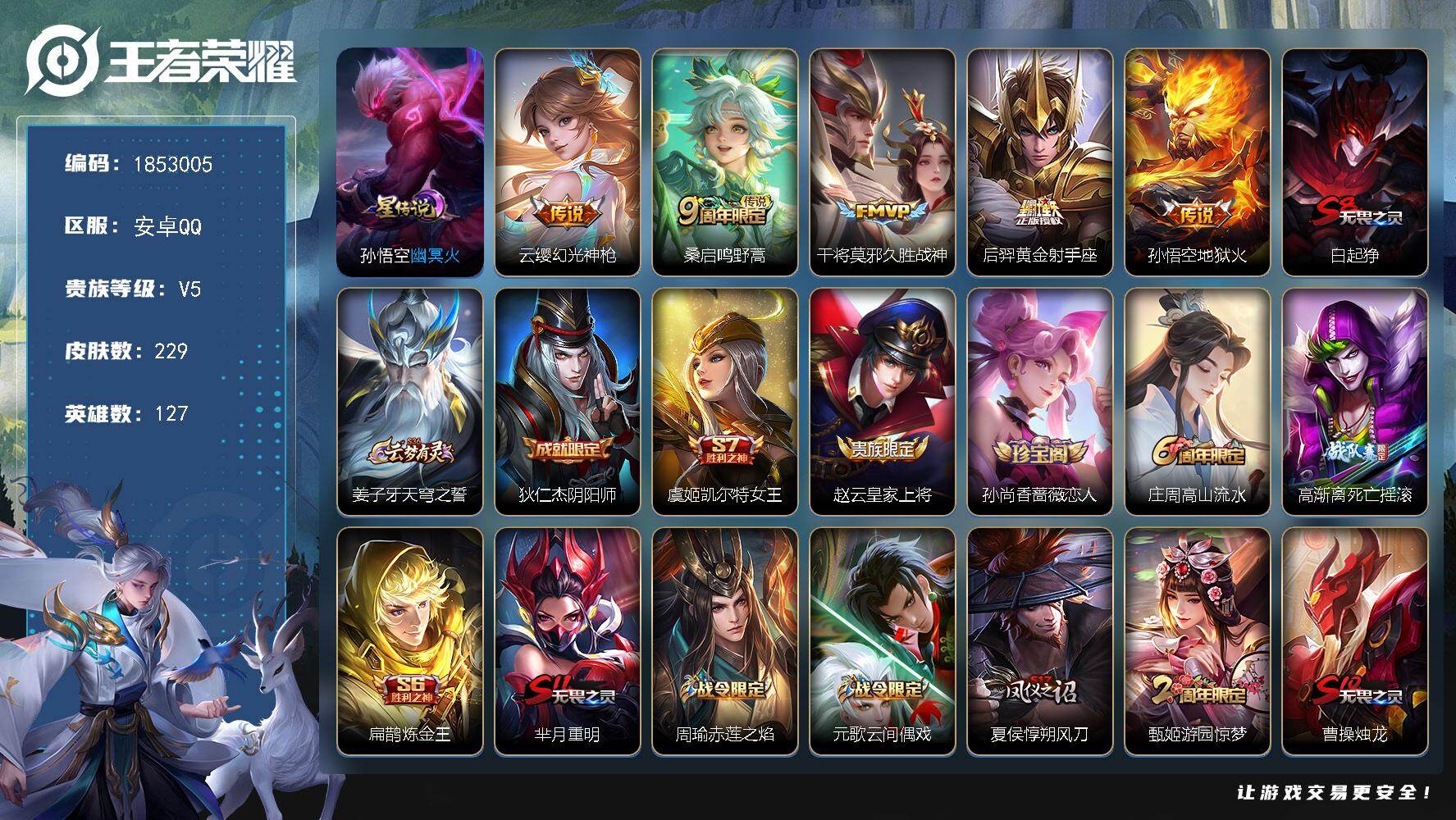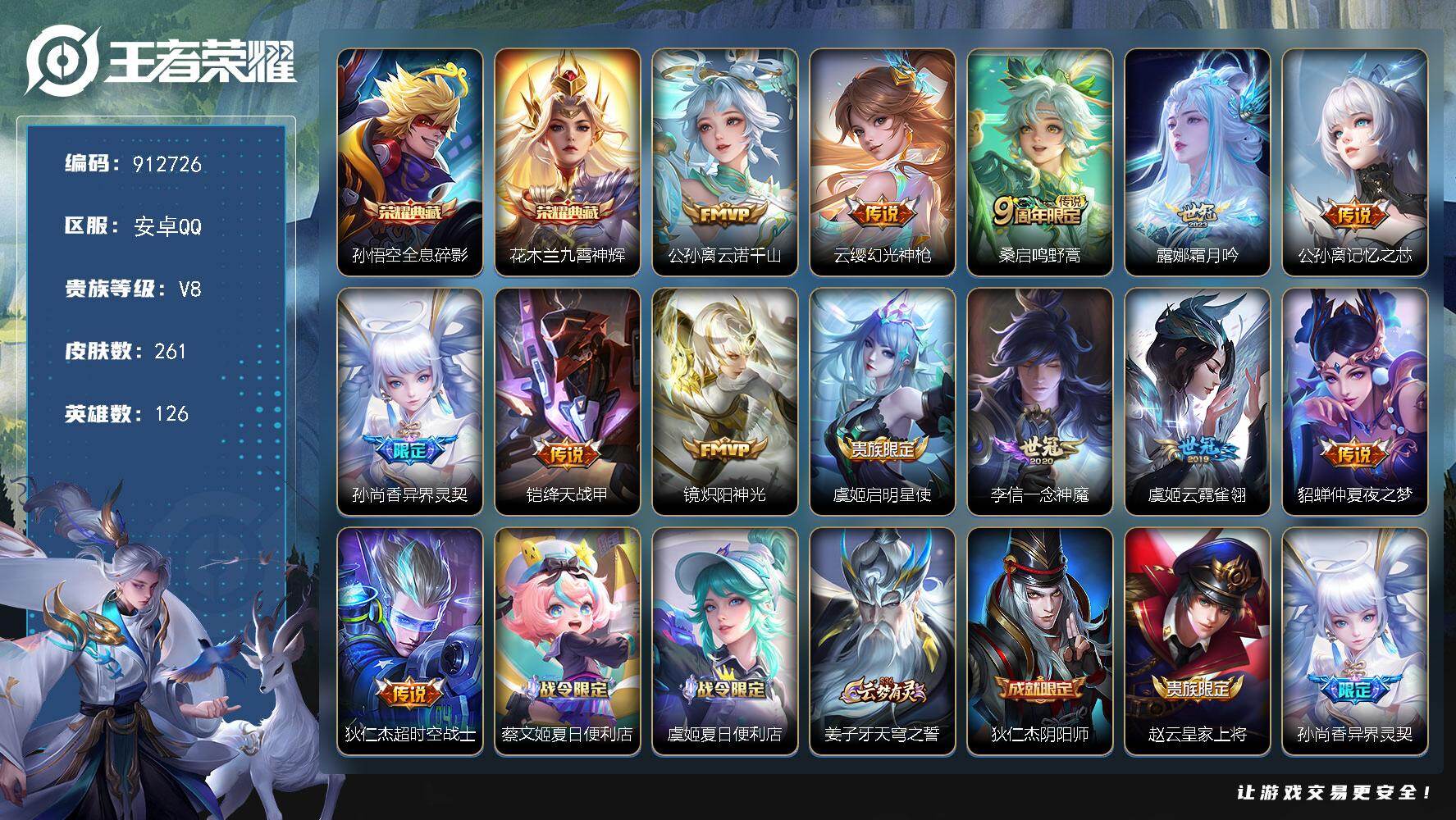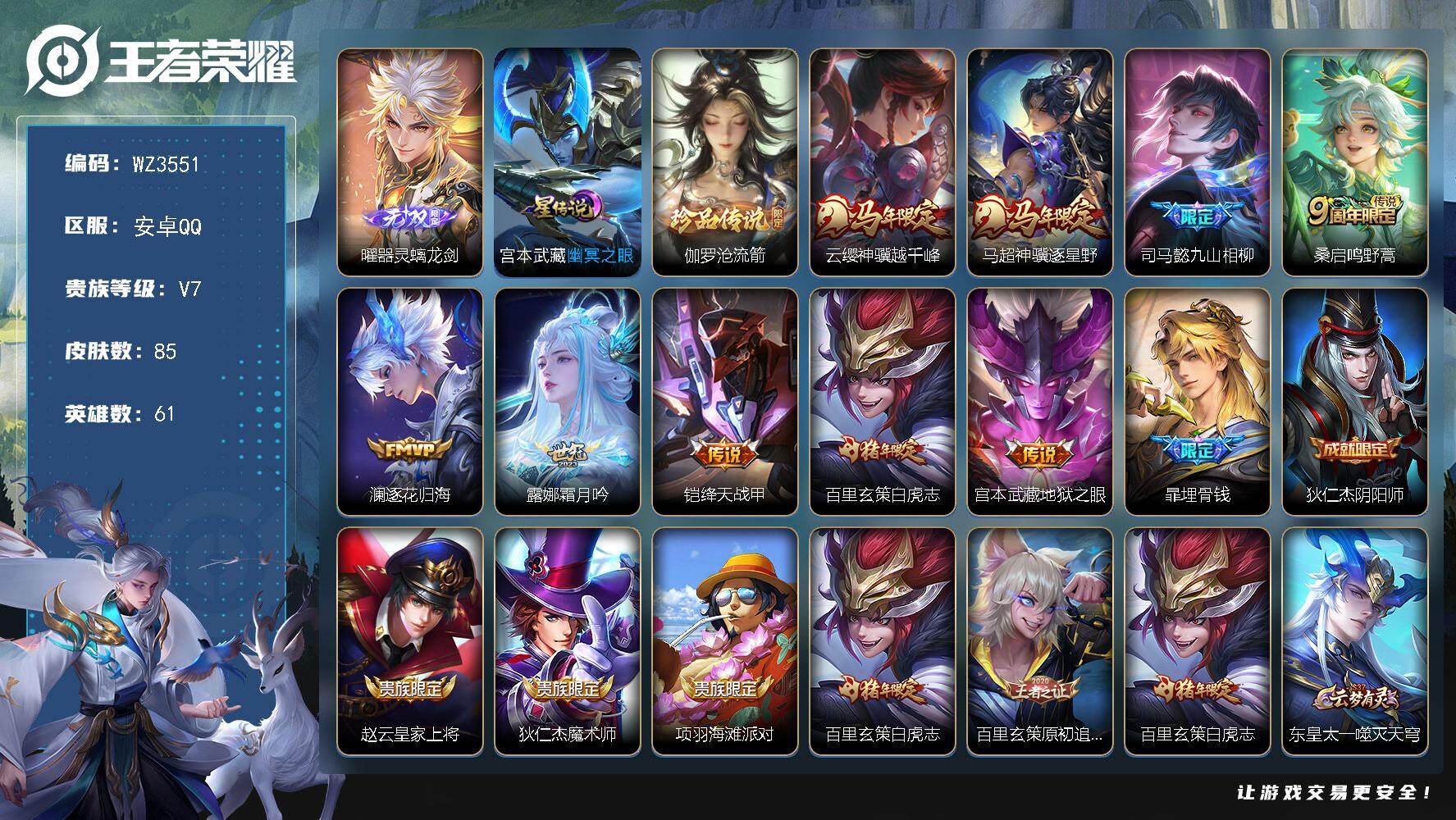 【秒换绑】安卓Q-V7-最强王者段位-61英雄-85皮肤-1无双-1珍品传说-