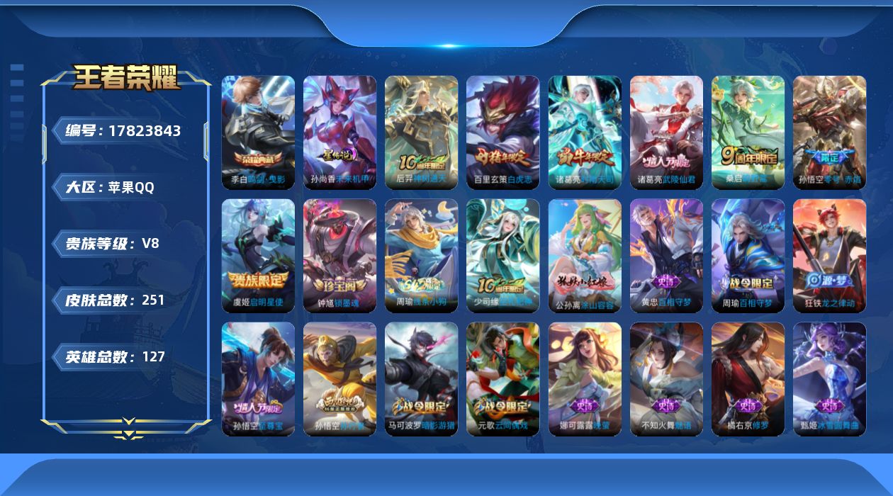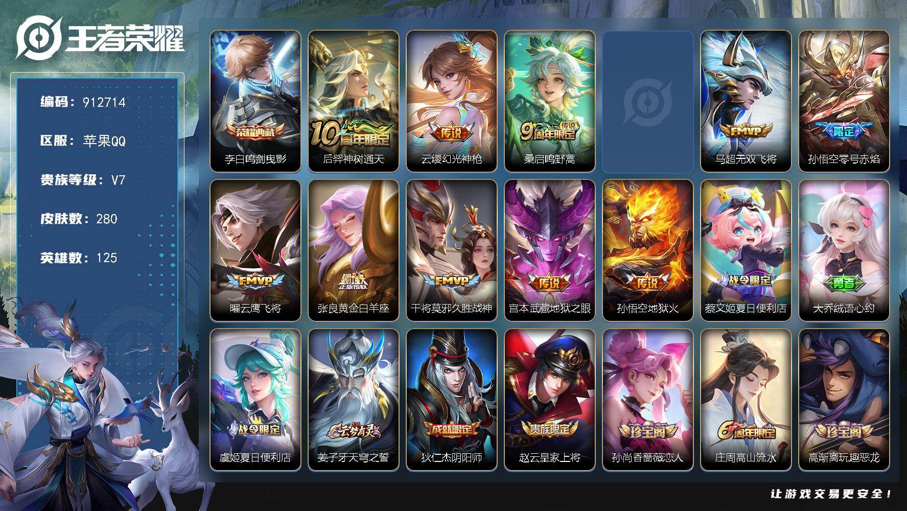 苹果Q-V4-最强王者段位-125英雄-280皮肤-1典藏皮肤-11传说-73史
