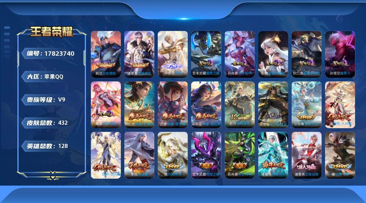 V9-最强王者段位-128英雄-432皮肤-2典藏皮肤-1无双-6星传说-23传说-131史诗