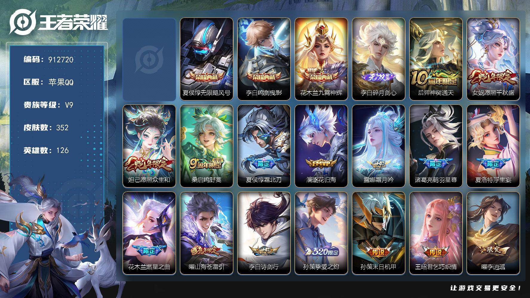 V7-最强王者段位-126英雄-352皮肤-3典藏皮肤-1无双-35传说-107史诗